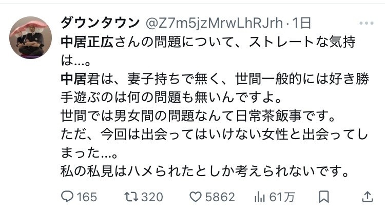 - これ言ってる中居ヅラたち、中居の言い分が通ったら女がこれから生きづらくなるのわかってんのかな