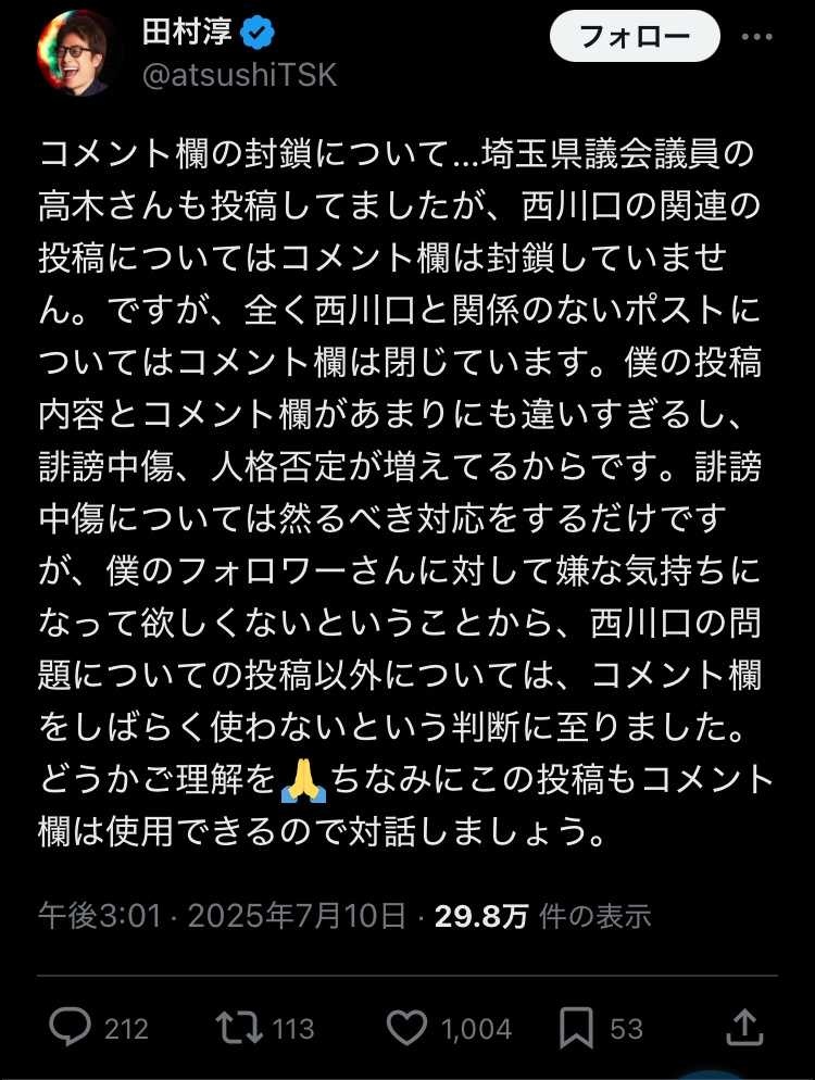 - 声明じゃなくてコメ封鎖の言い訳じゃん