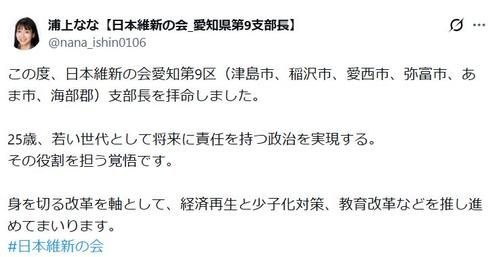 人気アイドル卒業→翌日に維新から衆院選出馬表明 電撃転身にファン騒然 公式も異例報告 (浦上奈々/ 松浦奈々) 2026年1月23日 最終更新日時 : 2026年1月23日 ぐはっアンテナ 八木勇征の魅力を徹底解剖!彼の成長と影響 【芸能】堺正章が語る 人気ドラマ『西遊記』打ち切りの真相 「天竺に着く前に終わった…」 【LDH】三代目JSB今市隆二メンバー 活動自粛・・・ 【画像】井口裕香さん(37)、まだまだ全然イケるwwwwwwwwwwwwwwwwwwwwwwwwwwwwwwwww ジャングリア沖縄がここまで叩かれている理由がわかったwwwwwwwwww 【苦悩】奥菜恵「自分では清純派とも魔性とも思っていなかった」 【画像】吉岡里帆、理想の男性は「京都の人より九州男児が好き」 【画像】広末涼子さん(45)の近影 【画像】ジャングリア沖縄🌿🦖、ファンもアンチも黙らせてしまう 元坂道?アイドルがデビュー 人気アイドル卒業→翌日に維新から衆院選出馬表明 電撃転身にファン騒然 公式も異例報告 (浦上奈々/ 松浦奈々) 1 : 2026/01/23(金) 11:15:55.48 ID:8/RcIltC9 人気アイドル卒業→翌日に維新から衆院選出馬表明 電撃転身にファン騒然 公式も異例報告 – ライブドアニュース 2026年1月23日 8時46分 名古屋を拠点とする人気ご当地アイドルグループ「dela」の元メンバー浦上奈々(浦上なな)氏(25)が、日本維新の会の公認候補として、衆院選(27日公示、2月8日投開票)愛知9区から出馬することが22日、発表された。 浦上氏は前日21日、「松浦奈々」名義で活動していた同グループの活動終了と所属事務所退所が発表されたばかり。電撃的な転身に、ファンからも驚きとエールが入り交じった反応があがっている。 「dela」の公式Xでは21日、「dela9期生松浦奈々事務所退所のお知らせ」と題し、「タイトル通り本日2026年1月21日(水)を持ちまして松浦奈々はdelaの活動を終了し、双方合意の上、名古屋美少女ファクトリーとの契約も解除となります」と報告。「尚、活動終了の事由につきましては明日1月22日(木)16:00ごろから本人を含む関係者から記者会見が行われる予定です」と記された。 翌22日には、維新が浦上氏を衆院選の公認候補としたことを発表。浦上氏は同日、政治活動を報告するインスタグラムで、会見を行ったことを発表した。ジャケット姿でガッツポーズする写真や会見の写真をアップし「本日は衆院選の公認候補予定者発表記者会見を名古屋市役所市政記者クラブ会見場にて行いました!緊張もありましたが、改めて覚悟が固まりました。若い世代の声、そして皆様のお声を国政に届けるため、全力で挑戦してまいります」と決意をつづった。 浦上氏は、その直近の投稿では、維新の愛知第9区(津島市、稲沢市、愛西市、弥富市、あま市、海部郡)支部長に任命されたことも報告。「25歳、若い世代として将来に責任を持つ政治を実現する。その役割を担う覚悟です。身を切る改革を軸として、経済再生と少子化対策、教育改革などを推し進めてまいります」と記していた。プロフィルでは「南山大学法学部卒業・元IT企業社員」と紹介されている。 「dela」の公式Xも、浦上氏の会見を受け投稿。「元delaメンバーの浦上なな(dela9期生松浦奈々)さん(25歳)が、本日名古屋市内記者クラブにて記者会見に出席し、第51回衆議院議員総選挙に立候補を表明いたしましたのでお知らせさせていただきます」と記すと、「※公認政党・選挙区の表記は控えさせていただき事象のみのお知らせとさせていただきます」と補足した。 一方で、浦上氏はアイドル活動を告知するインスタグラムでも22日、脱退を報告。「ここで得た経験や皆様からいただいた応援は、私にとって一生の宝物です。これまで出会えたすべての皆様に、心から感謝しています。本当にありがとうございました」などとつづった。14日には「生誕祭」イベントを行ったばかりで、ファンからは驚きの声もあがっている。 delaは2012年に名古屋で結成。初代キャプテンは犬塚志乃(犬塚絢香)、グラビアアイドルの沢口愛華らを輩出している。 人気アイドル卒業→翌日に維新から衆院選出馬表明 電撃転身にファン騒然 公式も異例報告 - ライブドアニュース 名古屋を拠点とする人気ご当地アイドルグループ「dela」の元メンバー浦上奈々(浦上なな)氏(25)が、日本維新の会の公認候補として、衆院選(27日公示、2月8日投開票)愛知9区から出馬することが22日、発表された ※画像 2 : 2026/01/23(金) 11:16:20.35 ID:0BYz5Tcw0 アイドルよりYou.Tubeで大宮公園のピースくん見てた方が楽しいからな 3 : 2026/01/23(金) 11:17:17.37 ID:5IaMqJtz0 人気?全く知らない 4 : 2026/01/23(金) 11:17:21.21 ID:KI9pt/H60 >>1円安・物価高やぞ!おまえら、政権交代も視野にいれとけよー 5 : 2026/01/23(金) 11:18:27.03 ID:4cszIHdF0 アイドルになにができるの 7 : 2026/01/23(金) 11:20:31.30 ID:mwdNI3lw0 >>5働いてないオマエよりマシじゃね? 9 : 2026/01/23(金) 11:21:23.81 ID:QuQAmGFl0 delaというよりdaleだな 10 : 2026/01/23(金) 11:21:30.15 ID:iHSm41HM0 人気アイドルとは? 12 : 2026/01/23(金) 11:22:27.29 ID:OTb+WjWG0 25歳ってことは年齢最低ラインか 13 : 2026/01/23(金) 11:2