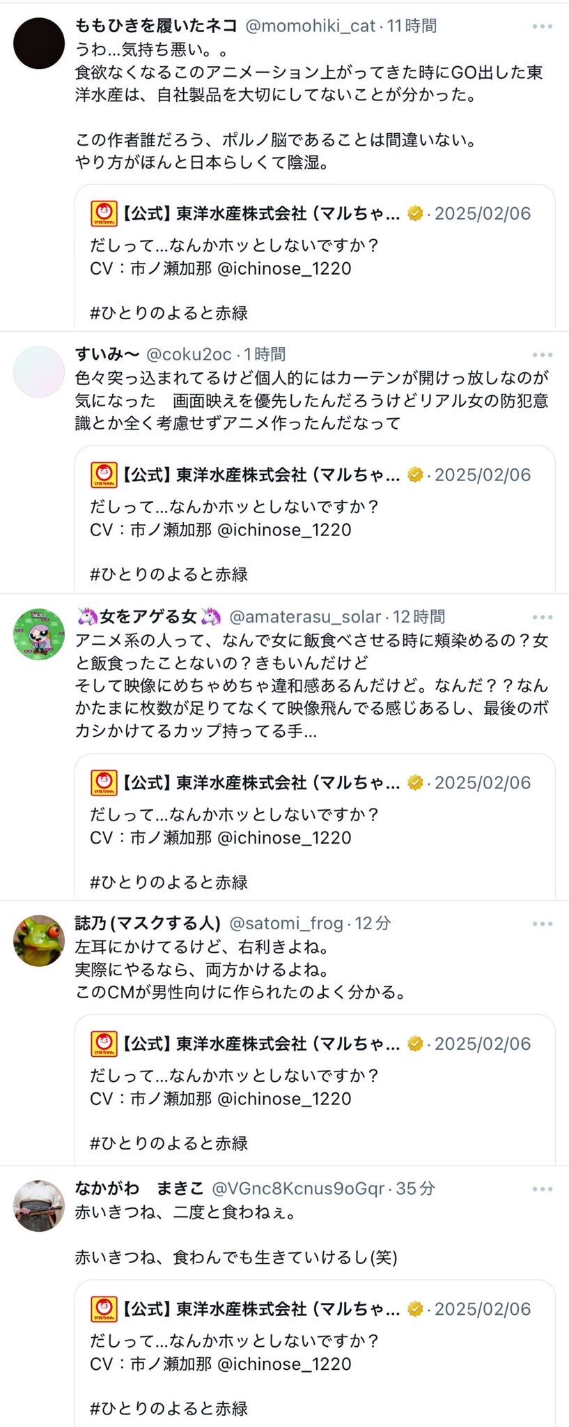 食品会社の東洋水産が販売するカップ麺「マルちゃん」のアニメCMが、X(旧ツイッター)で炎上を見せています。若い女性が自分の部屋で「マルちゃん 赤いきつね」を食べるという、何気ない日常を描いた34秒の動画ですが、これに対し「性的だ」「キモい」などの言葉が向けられています。