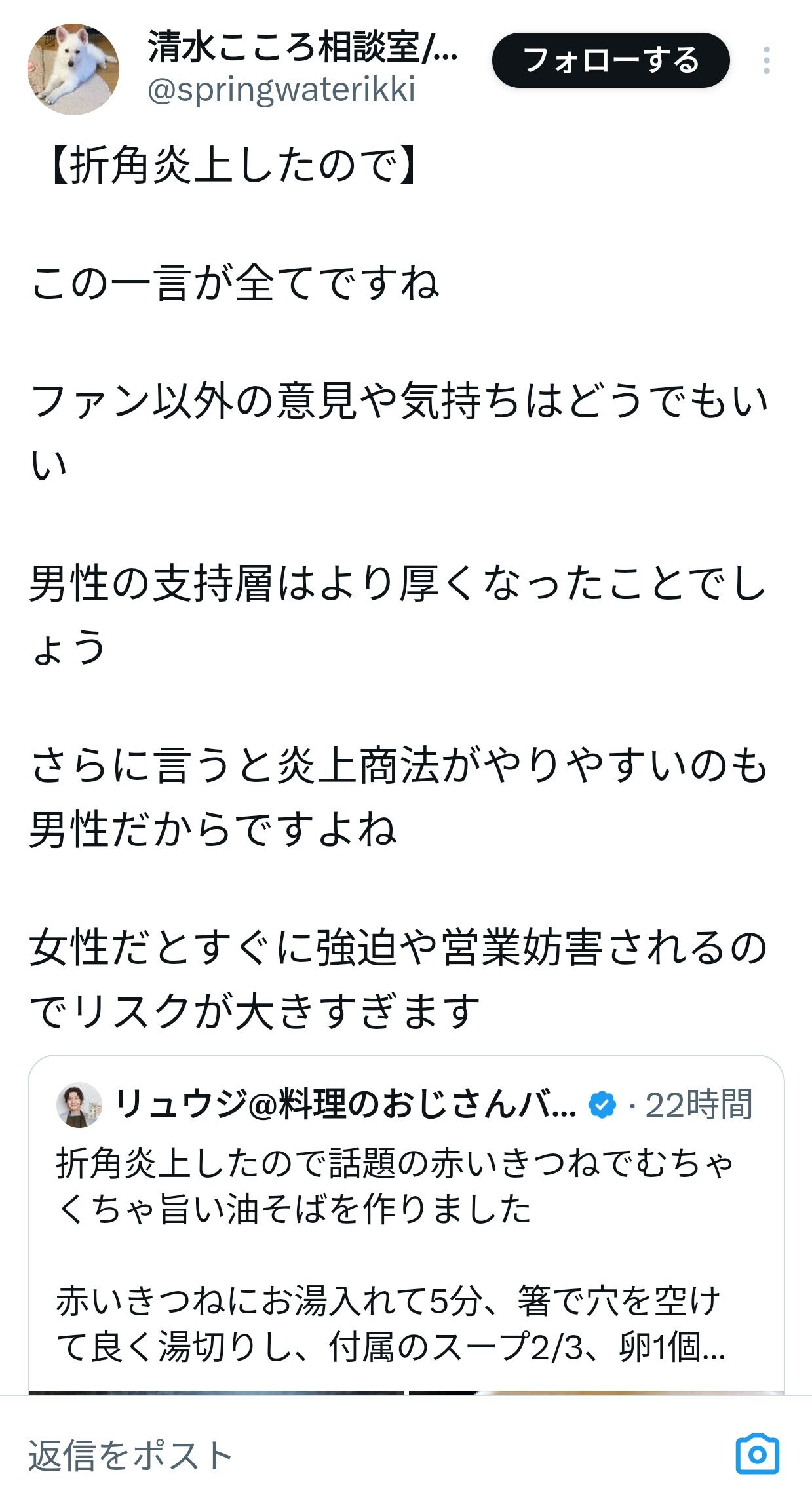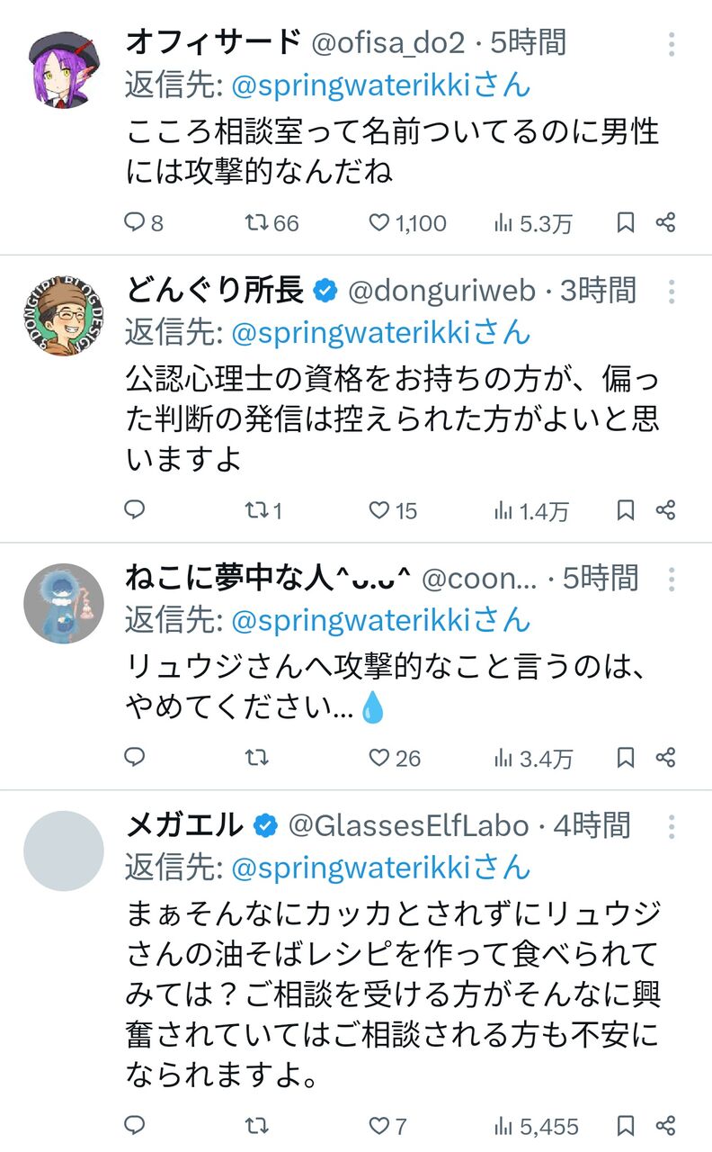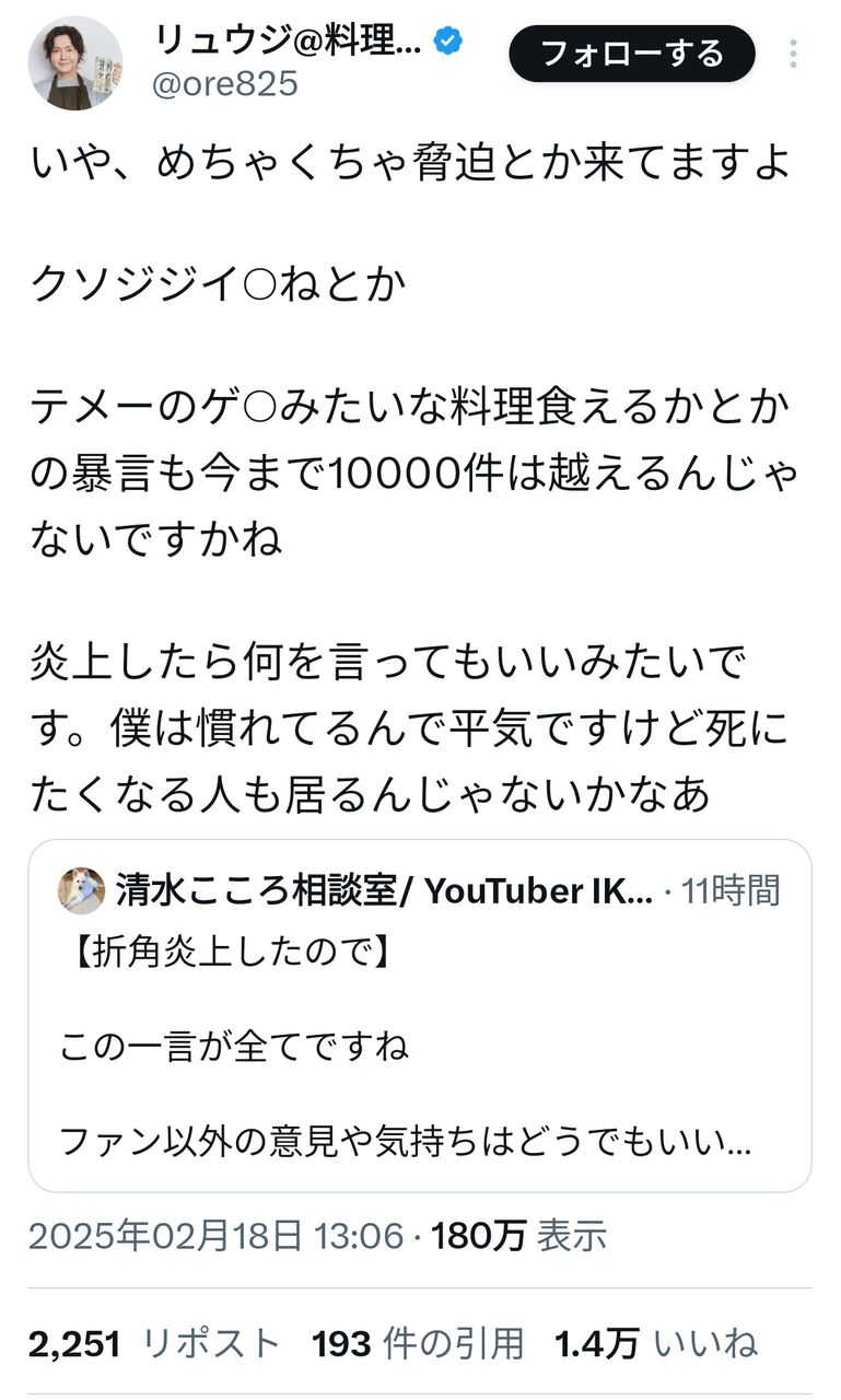 【悲報】料理のリュウジ、男嫌い?な自称公認心理師に攻撃される