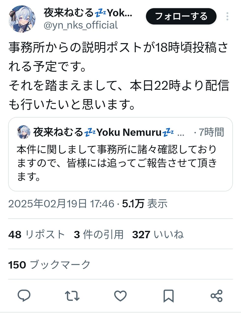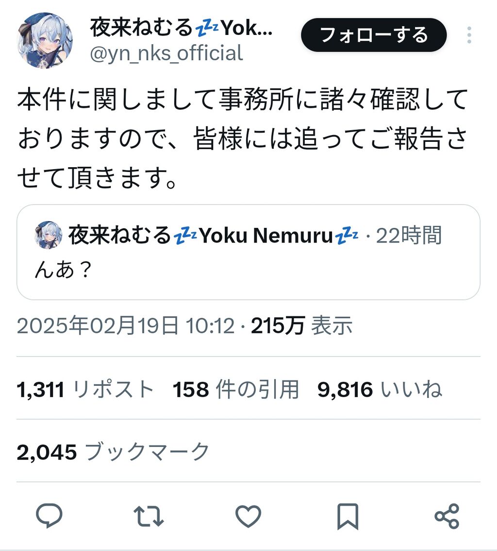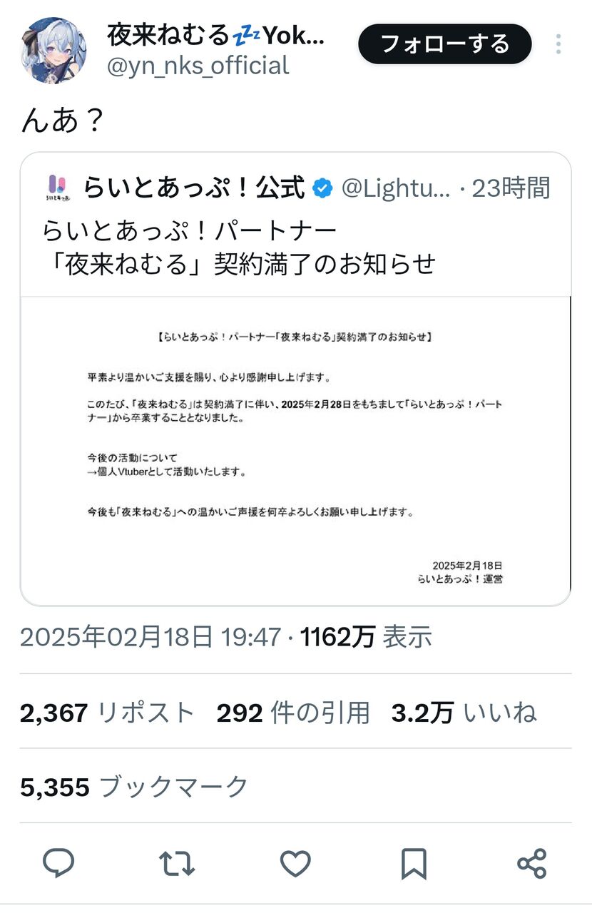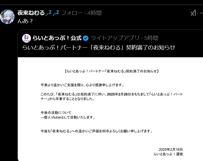 【困惑】VTuberさん、事務所が勝手に卒業発表”夜来ねむる”「んあ?」