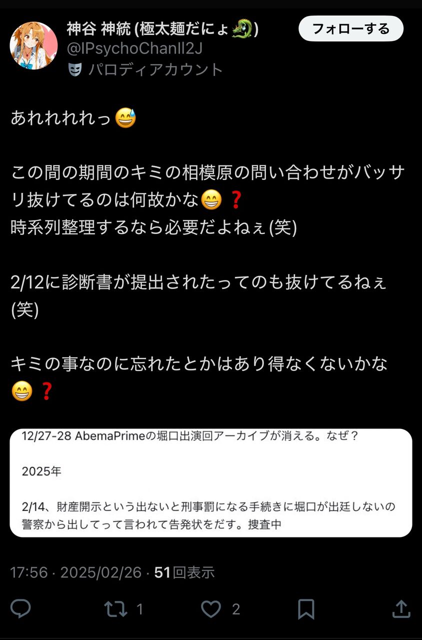 【悲報】暇空さん、警察へ問い合わせした日を忘れる