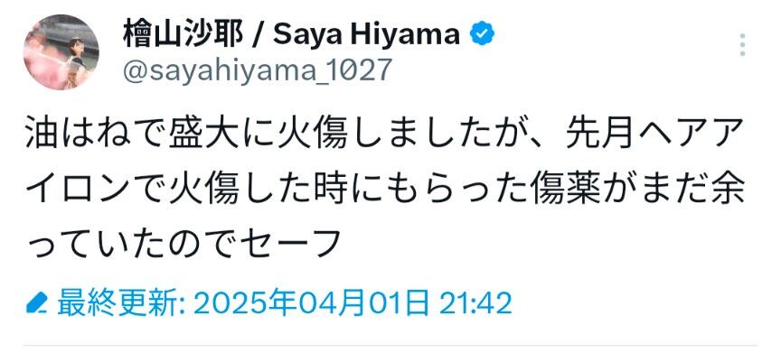 【悲報】檜山沙耶、油はねで大火傷!傷薬でセーフ(∩´∀`)∩
