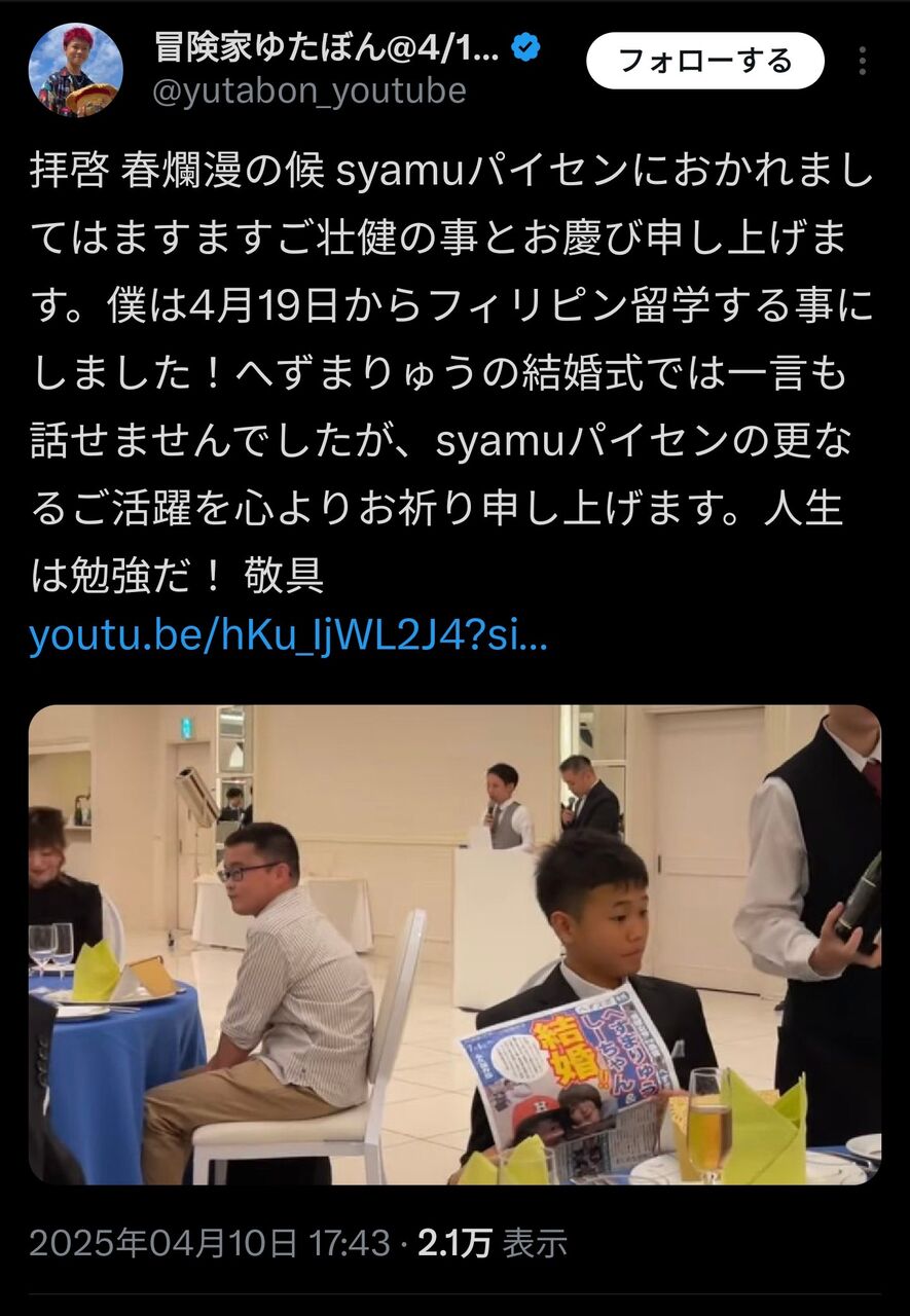 【悲報】留学する”ゆたぼん”、例の写真持ち出してsyamuさん煽る 2025年4月13日 最終更新日時 : 2025年4月13日 ぐはっアンテナ 八木勇征の魅力を徹底解剖!彼の成長と影響 【芸能】堺正章が語る 人気ドラマ『西遊記』打ち切りの真相 「天竺に着く前に終わった…」 【LDH】三代目JSB今市隆二メンバー 活動自粛・・・ 【画像】井口裕香さん(37)、まだまだ全然イケるwwwwwwwwwwwwwwwwwwwwwwwwwwwwwwwww ジャングリア沖縄がここまで叩かれている理由がわかったwwwwwwwwww 【苦悩】奥菜恵「自分では清純派とも魔性とも思っていなかった」 【画像】吉岡里帆、理想の男性は「京都の人より九州男児が好き」 【画像】広末涼子さん(45)の近影 【画像】ジャングリア沖縄🌿🦖、ファンもアンチも黙らせてしまう 元坂道?アイドルがデビュー 【悲報】留学する”ゆたぼん”、例の写真持ち出してsyamuさん煽る ゆたぼん ゆたぼん(2008年〈平成20年〉12月12日 - )は、日本のYouTuber。大阪府出身。沖縄県宜野湾市在住。本名は中村 逞珂(なかむら ゆたか)。青年革命家を自称し、かつて自身のYouTubeチャンネルで「学校は行きたい時に行く」「不登校の自由」などを主張し動画配信を行っていた… 78キロバイト (12,199 語) - 2025年4月8日 (火) 11:01 (出典 gekibuzz.com) (出典 【オワコン同士】ゆたぼん、syamuを煽る) 1 それでも動く名無し :2025/04/11(金) 19:24:02.17 ID:AEg4GgJ10 トクリュウになりそう (出典 i.imgur.com) (出典 【オワコン同士】ゆたぼん、syamuを煽る) 続きを読む 続きを見る 八木勇征の魅力を徹底解剖!彼の成長と影響 【芸能】堺正章が語る 人気ドラマ『西遊記』打ち切りの真相 「天竺に着く前に終わった…」 【LDH】三代目JSB今市隆二メンバー 活動自粛・・・ 【画像】井口裕香さん(37)、まだまだ全然イケるwwwwwwwwwwwwwwwwwwwwwwwwwwwwwwwww ジャングリア沖縄がここまで叩かれている理由がわかったwwwwwwwwww 【苦悩】奥菜恵「自分では清純派とも魔性とも思っていなかった」 【画像】吉岡里帆、理想の男性は「京都の人より九州男児が好き」 【画像】広末涼子さん(45)の近影 関連記事 関連記事はありません。