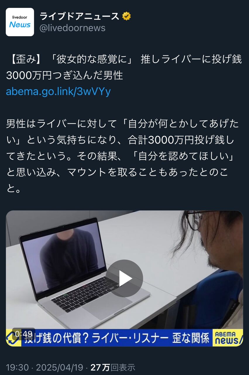【推し活】VTuberへの投げ銭で消えた3000万円「もう何も残っていない」 2025年4月25日 最終更新日時 : 2025年4月25日 ぐはっアンテナ 八木勇征の魅力を徹底解剖!彼の成長と影響 【芸能】堺正章が語る 人気ドラマ『西遊記』打ち切りの真相 「天竺に着く前に終わった…」 【LDH】三代目JSB今市隆二メンバー 活動自粛・・・ 【画像】井口裕香さん(37)、まだまだ全然イケるwwwwwwwwwwwwwwwwwwwwwwwwwwwwwwwww ジャングリア沖縄がここまで叩かれている理由がわかったwwwwwwwwww 【苦悩】奥菜恵「自分では清純派とも魔性とも思っていなかった」 【画像】吉岡里帆、理想の男性は「京都の人より九州男児が好き」 【画像】広末涼子さん(45)の近影 【画像】ジャングリア沖縄🌿🦖、ファンもアンチも黙らせてしまう 元坂道?アイドルがデビュー 【推し活】VTuberへの投げ銭で消えた3000万円「もう何も残っていない」 投げ銭 投げること。第二義には、金銭を与えること。第三義には、投銭(なげぜに、なげせん)のこと、すなわち、大道芸人や乞食に対して見物人や通行人が投げ与える銭のこと。 また、2010年代後半以降にはインターネット用語として、動画共有サービスなどコンテンツのネット配信者に対する送金・寄付を意味する「投げ銭… 27キロバイト (3,396 語) - 2025年3月10日 (月) 15:32 (出典 【悲報】弱者男性さん、VTuberに所持金3000万全て投げ銭し、もう何も残っていないと、泣く) 1 以下、5ちゃんねるからVIPがお送りします :2025/04/19(土) 23:44:43.620 ID:uVypNsYGM (出典 i.imgur.com) (出典 i.imgur.com) (出典 i.imgur.com) (出典 【悲報】弱者男性さん、VTuberに所持金3000万全て投げ銭し、もう何も残っていないと、泣く) 続きを読む 続きを見る 八木勇征の魅力を徹底解剖!彼の成長と影響 【芸能】堺正章が語る 人気ドラマ『西遊記』打ち切りの真相 「天竺に着く前に終わった…」 【LDH】三代目JSB今市隆二メンバー 活動自粛・・・ 【画像】井口裕香さん(37)、まだまだ全然イケるwwwwwwwwwwwwwwwwwwwwwwwwwwwwwwwww ジャングリア沖縄がここまで叩かれている理由がわかったwwwwwwwwww 【苦悩】奥菜恵「自分では清純派とも魔性とも思っていなかった」 【画像】吉岡里帆、理想の男性は「京都の人より九州男児が好き」 【画像】広末涼子さん(45)の近影 関連記事 関連記事はありません。