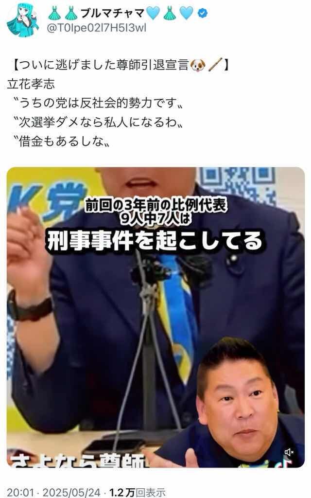 【カルト】立花孝志「うちの党は反社会的勢力です」と認め引退を宣言する。