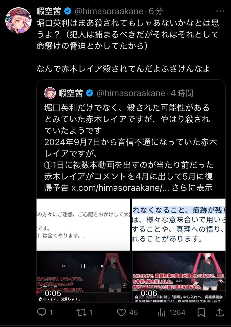 自称作家の暇空茜氏が、赤木レイアの殺害(56されてないし、死んでません)に激怒し、堀口英利について命がけの脅迫を(そんな事実はありません)していたことを指摘。