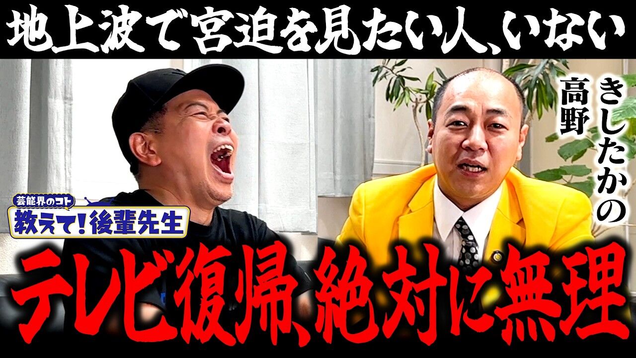 今回の動画では「教えて!後輩先生」という、後輩芸人を呼んで「先生」に見立て、いろいろ質問したりぶっちゃけ相談などをする企画を行った。ゲストはお笑いコンビ、きしたかのの高野正成(36)。動画終盤で、宮迫が高野に「地上波に復帰するにはどうすればいい?」という相談を行った。