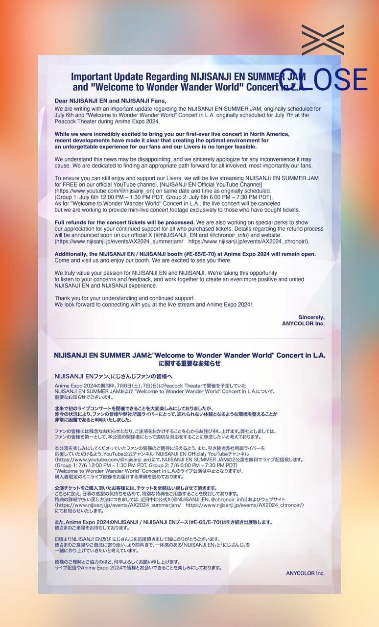「Anime Expo 2024」の期間中、7月6日(土)、7日(日)にロサンゼルス Peacock Theaterにて開催を予定していた「NIJISANJI EN SUMMER JAM」「"Welcome to Wonder Wander World" Concert in L.A.」についての重要なお知らせです。