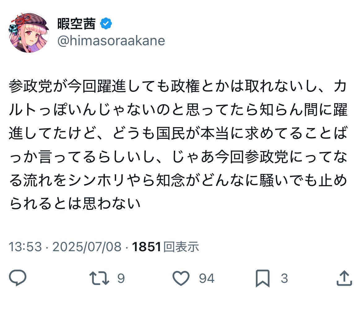 【朗報】最近の暇空茜氏、参政党に夢中♪「とってもお似合いで草」