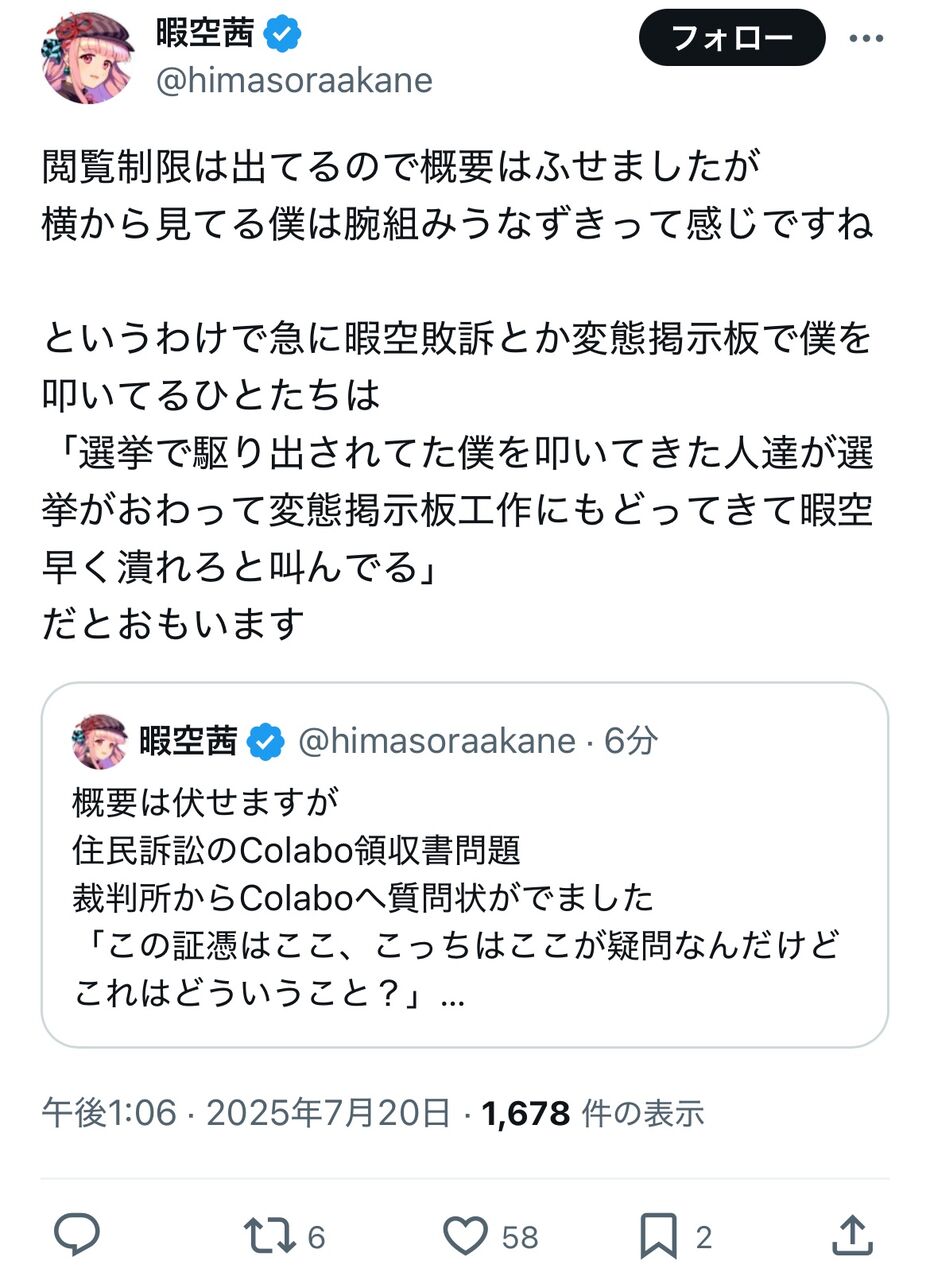 >「選挙で駆り出されてた僕を叩いてきた人達が選挙がおわって*掲示板工作にもどってきて暇空早く潰れろと叫んでる」