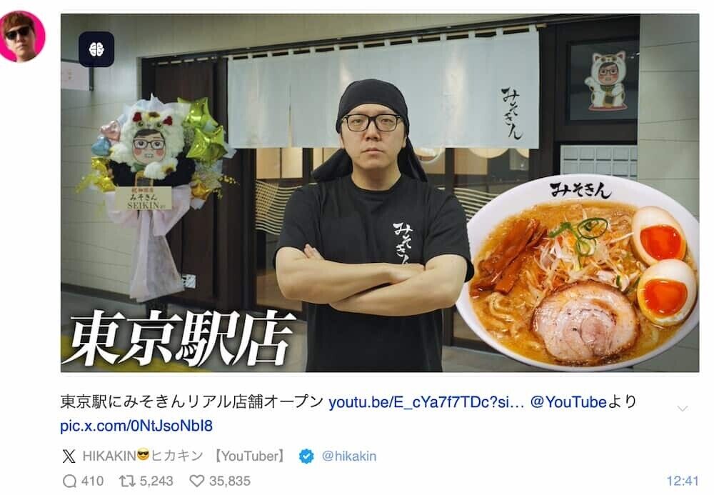 YouTuberのHIKAKINが3日、東京を代表するラーメンの名店が集まる東京駅の人気ゾーン、東京駅一番街地下1階「東京ラーメンストリート」に監修する味噌ラーメン「みそきん」の初のリアル店舗を展開することが発表された。