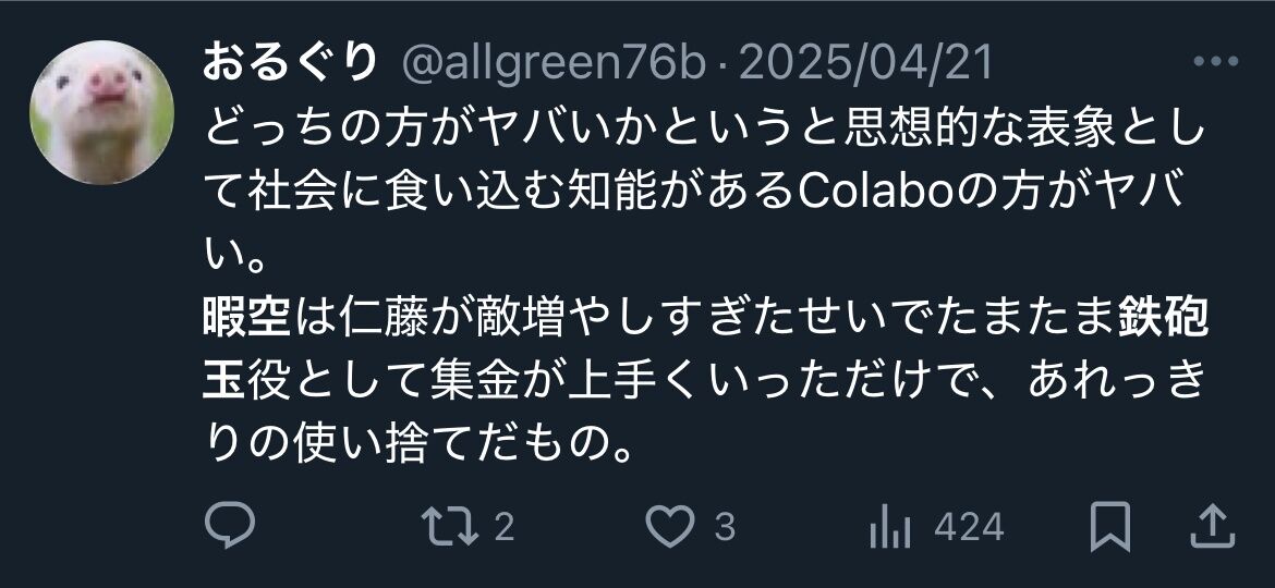 【軍師気取り】colaboを叩く元暇アノン高みの見物「暇空は、鉄砲玉としては有能だよな」