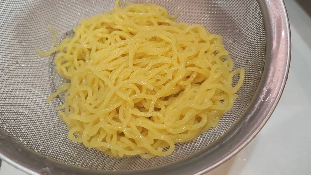 中華麺130gを茹で氷で冷やしよく水気を切ったものを混ぜラー油