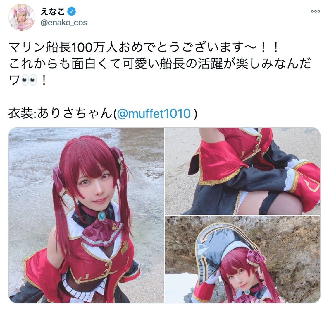 えなこはVTuberの宝鐘マリンに扮(ふん)したコスプレでコミケに参戦。しかし「マリン船長の胸デカすぎてボタンはじけた」と、胸元の写真を添えてポストした。続けて「服の上から凹凸を表現するのが難しくてヌーブラ3枚入れてたので文字通り盛りすぎた ちょうどサークル並んでたみんなびっくりさせてごめん」と、コスプレーヤーとしての再現度にこだわるあまりの出来事だったことを明かした。