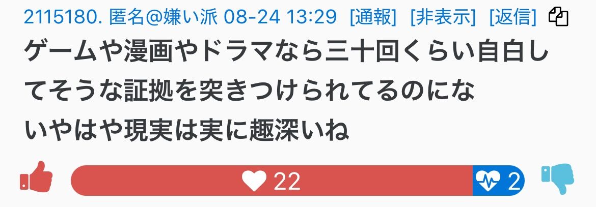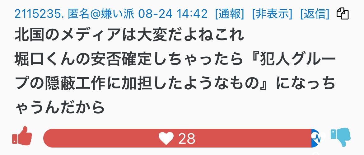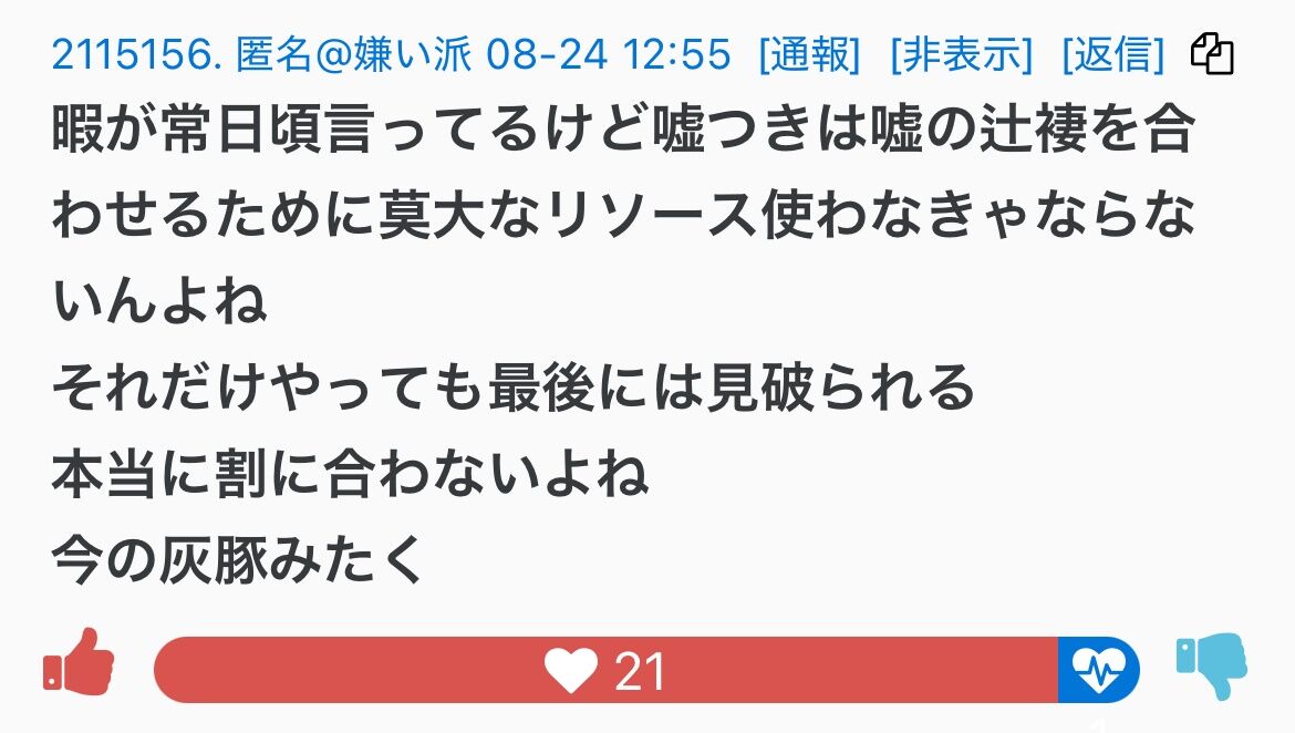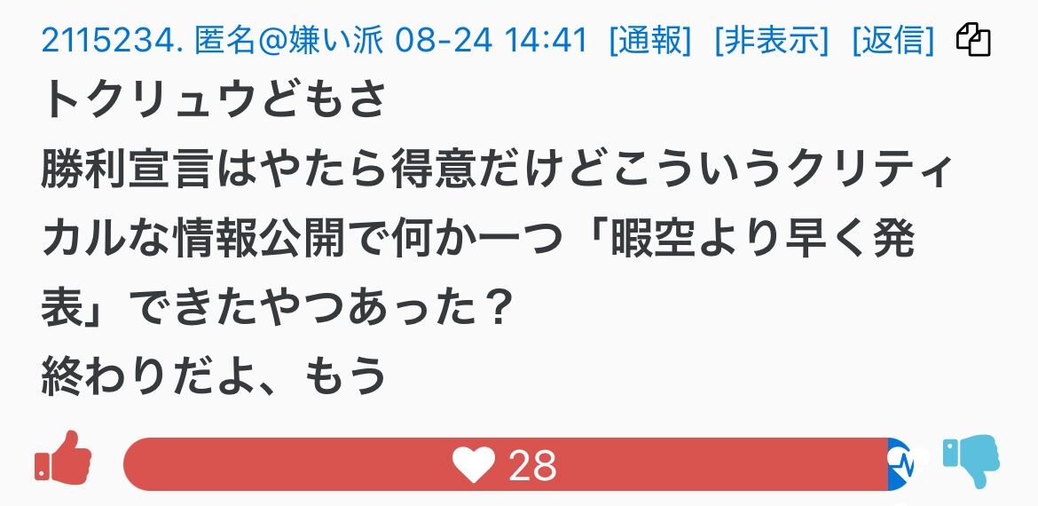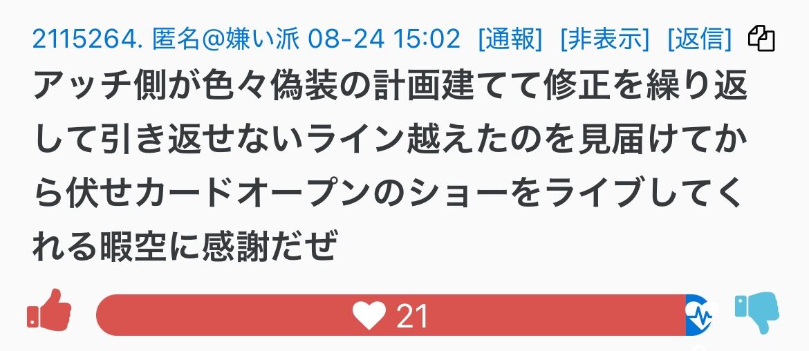 堀口くんに提訴されたり、カルピス軍団に絡まれたりで、濃ゆい暇アノンTwitterではほとんど見かけなくなって、彼らの反応はここでしか見れない