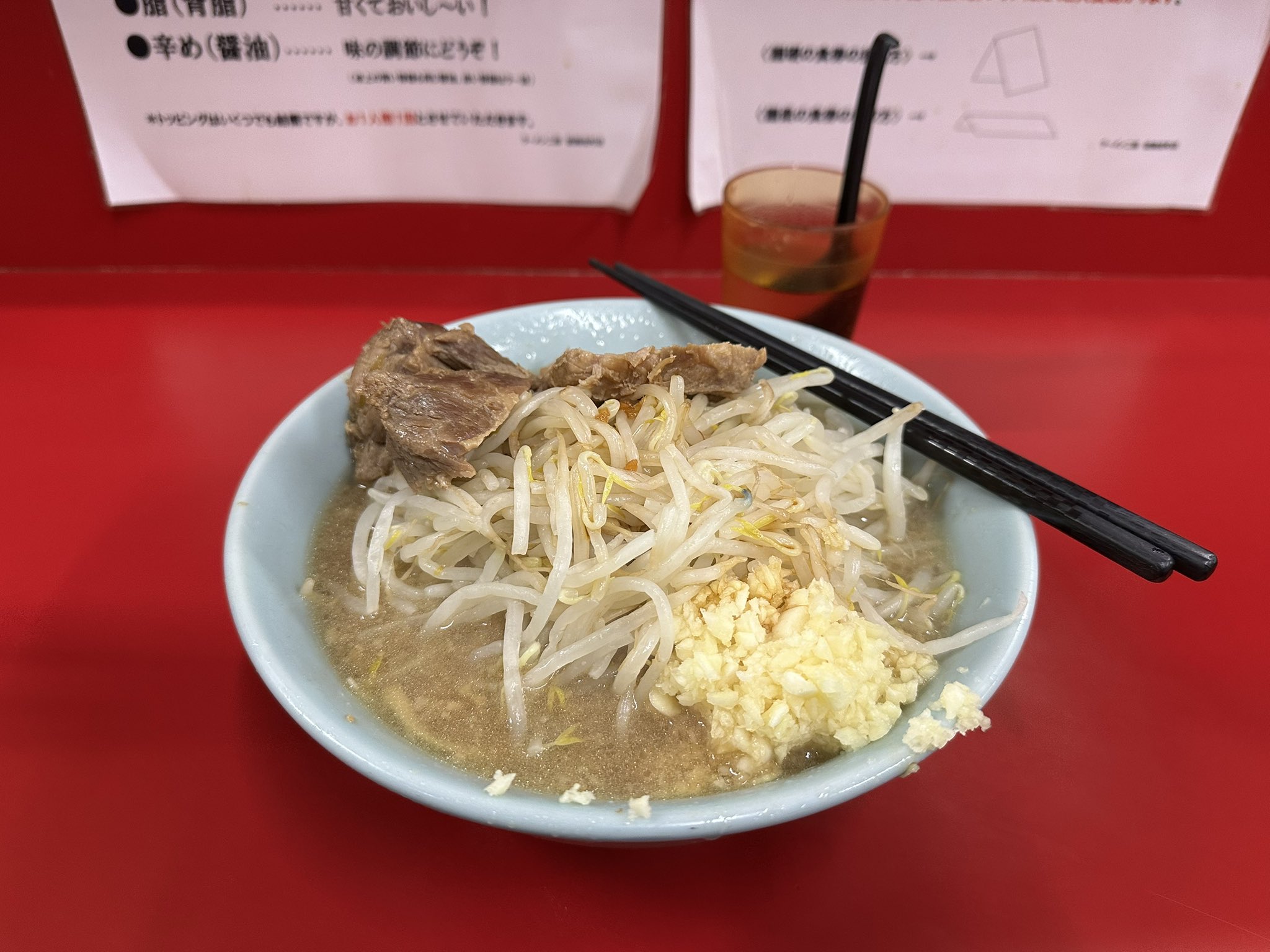 大量のもやしに大量のニンニクが乗った二郎ラーメン。かなりのカロリーで知られているが、ひろゆきは汁まで残すことなく完食していた。
