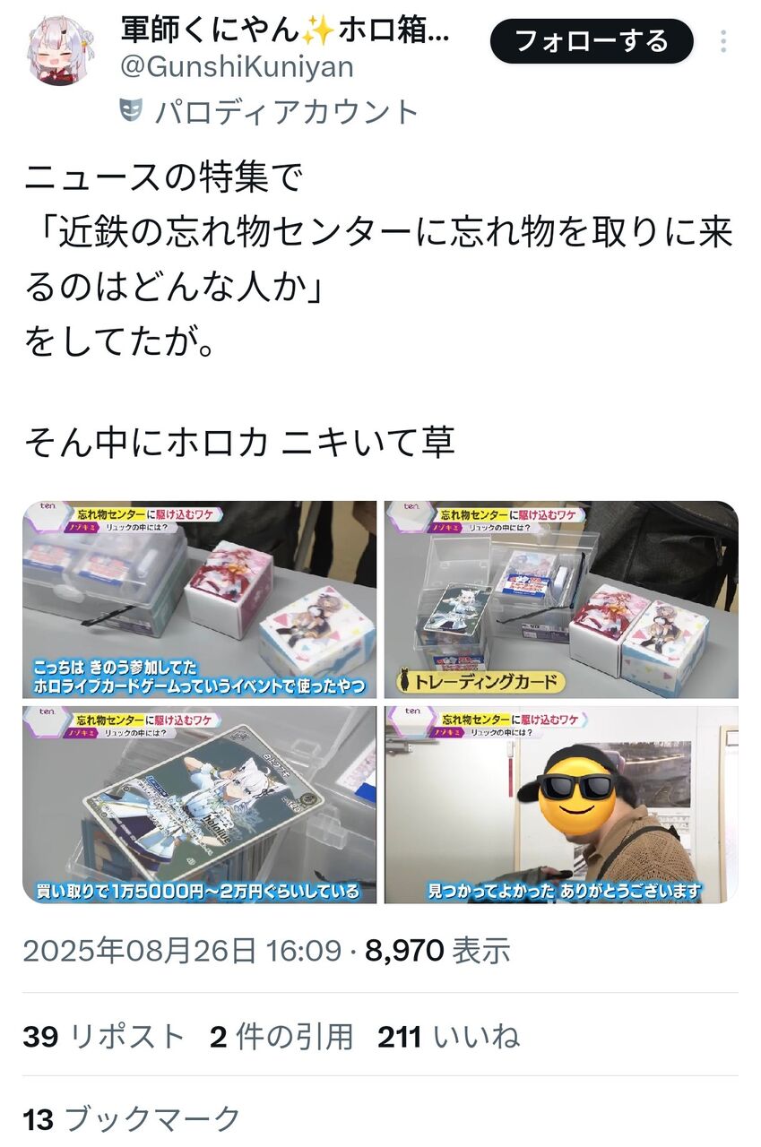 【画像】ホロライブファン、駅に大切なグッズを忘れ物ww「ホロカ大会で使った奴です見つかってよかった」