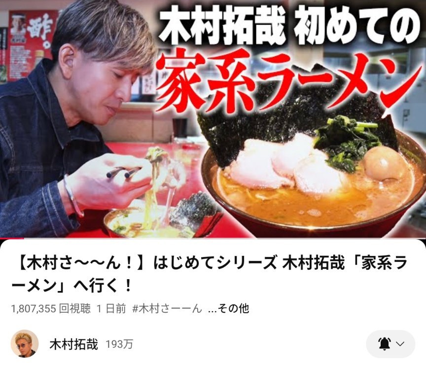 木村拓哉「家系ラーメン動画」が440万再生の大バズり!「キムタクはYouTubeに不向き」説からの大逆転劇