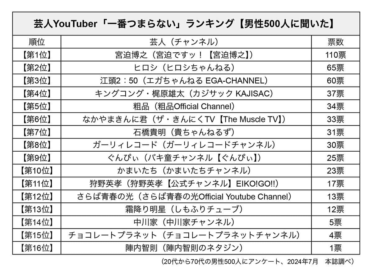 本誌は全国の男性500人にアンケート調査を実施。100万人登録者超え、かつお笑い関連の企画を定期的にアップしているYouTubeチャンネルを持つ芸人16組から、「つまらない」と思う芸人YouTuberを1組選んでもらった。