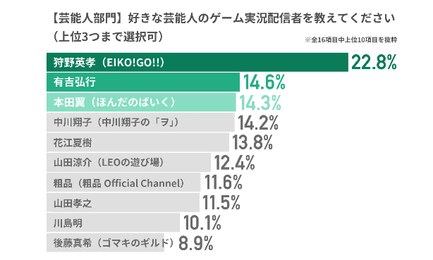 ゲーム実況をよく見る人から多くの支持を集めた「芸能人」は誰だったのでしょうか。さっそくランキングを見てみましょう!