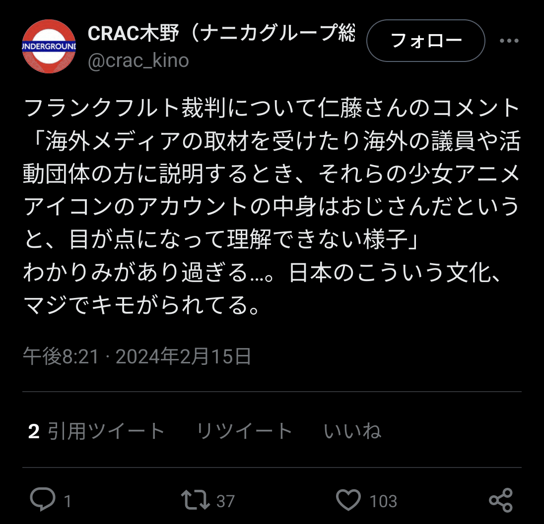 事あるごとにアニメアイコンを擦ることに限って言えば、女の犯罪報道の度に「ちなみに女」とか付けるアンフェと同じ嫌悪感を覚える