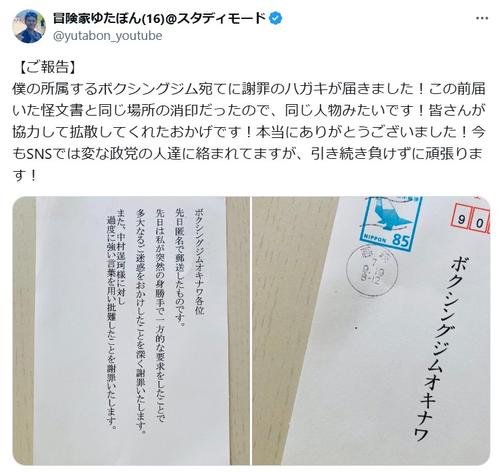 ゆたぼんは「【ご報告】僕の所属するボクシングジム宛てに謝罪のハガキが届きました!この前届いた怪文書と同じ場所の消印だったので、同じ人物みたいです!」と記述。