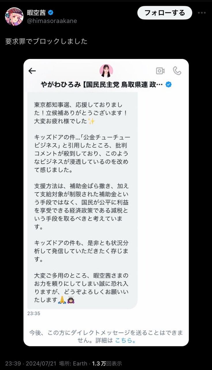 【炎上】国民民主党員さん、暇空茜に助けを求めるもDM晒される
