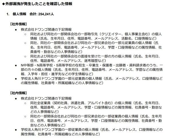 漏えいした個人情報は25万4241人分で、ドワンゴの全従業員や取引先、N中等部・N高等学校などの在校生・卒業生の一部などが含まれていた。「ニコニコ」ユーザーのアカウント情報の漏えいは確認していないという。