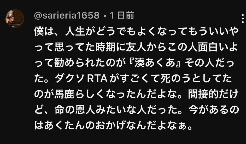 【女神】湊あくあ、1人の男の命を救う「あくたんは恩人」 2024年8月10日 最終更新日時 : 2024年8月10日 ぐはっアンテナ 八木勇征の魅力を徹底解剖!彼の成長と影響 【芸能】堺正章が語る 人気ドラマ『西遊記』打ち切りの真相 「天竺に着く前に終わった…」 【LDH】三代目JSB今市隆二メンバー 活動自粛・・・ 【画像】井口裕香さん(37)、まだまだ全然イケるwwwwwwwwwwwwwwwwwwwwwwwwwwwwwwwww ジャングリア沖縄がここまで叩かれている理由がわかったwwwwwwwwww 【苦悩】奥菜恵「自分では清純派とも魔性とも思っていなかった」 【画像】吉岡里帆、理想の男性は「京都の人より九州男児が好き」 【画像】広末涼子さん(45)の近影 【画像】ジャングリア沖縄🌿🦖、ファンもアンチも黙らせてしまう 元坂道?アイドルがデビュー 【女神】湊あくあ、1人の男の命を救う「あくたんは恩人」 湊あくあ 湊 あくあ(みなと あくあ、12月1日 - )は、日本のバーチャルYouTuber。所属事務所はホロライブプロダクションで同事務所の女性バーチャルYouTuberグループ・ホロライブの2期生。愛称は主にあくたん、AKUKIN、英語圏では頭部が赤たまねぎに見えることからOnionなど。また、同事務所… 37キロバイト (3,861 語) - 2024年8月7日 (水) 07:32 (出典 youtuber-items.com) (出典 湊あくあさん、間接的に🤓の命を救ってしまうwwww) 1 それでも動く名無し 警備員[Lv.3][新芽] :2024/08/09(金) 19:00:14.79 ID:z0T4lKWN0 (出典 i.imgur.com) (出典 湊あくあさん、間接的に🤓の命を救ってしまうwwww) 続きを読む 続きを見る 八木勇征の魅力を徹底解剖!彼の成長と影響 【芸能】堺正章が語る 人気ドラマ『西遊記』打ち切りの真相 「天竺に着く前に終わった…」 【LDH】三代目JSB今市隆二メンバー 活動自粛・・・ 【画像】井口裕香さん(37)、まだまだ全然イケるwwwwwwwwwwwwwwwwwwwwwwwwwwwwwwwww ジャングリア沖縄がここまで叩かれている理由がわかったwwwwwwwwww 【苦悩】奥菜恵「自分では清純派とも魔性とも思っていなかった」 【画像】吉岡里帆、理想の男性は「京都の人より九州男児が好き」 【画像】広末涼子さん(45)の近影 関連記事 関連記事はありません。