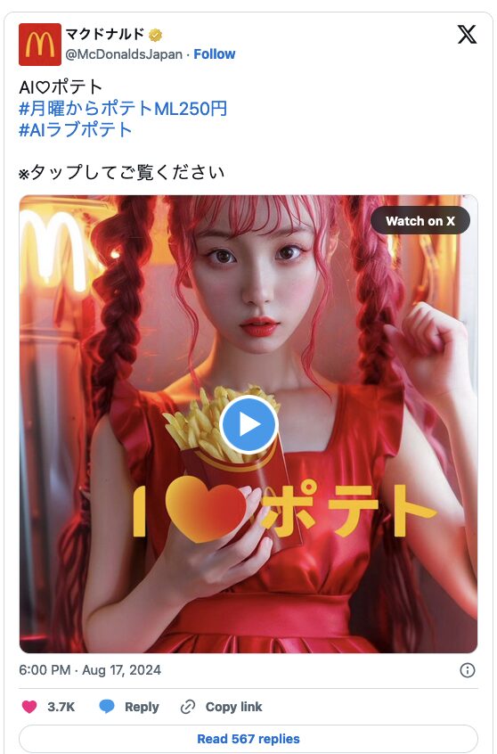 映像はXアカウントなどで公開されており、本日8月19日(月)から始まる「マックフライポテト」の250円セールを告知するために作成されたもの。音楽に合わせて「お得に食べられる」ことを伝える内容になっているのだが、その映像には画像生成AIが用いられているという。