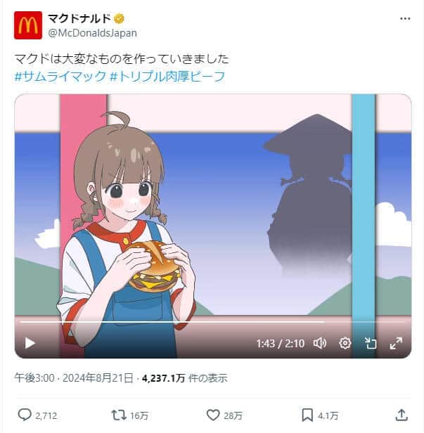 マクドナルドの公式Xが2024年8月21日に、「マクドは大変なものを作っていきました」とする動画を公開した。Xでは、内容への反響とともに、マクドナルドが公式Xで「マクド」の略称を使ったことにも驚きの声が寄せられている。 VIPQ2_EXTDAT: default:default:1000:512:donguri=2/1: EXT was configured