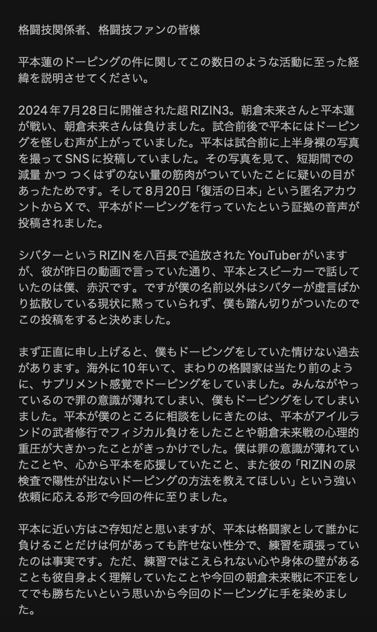 【炎上】平本蓮へのドーピング関与を日本館の代表が謝罪