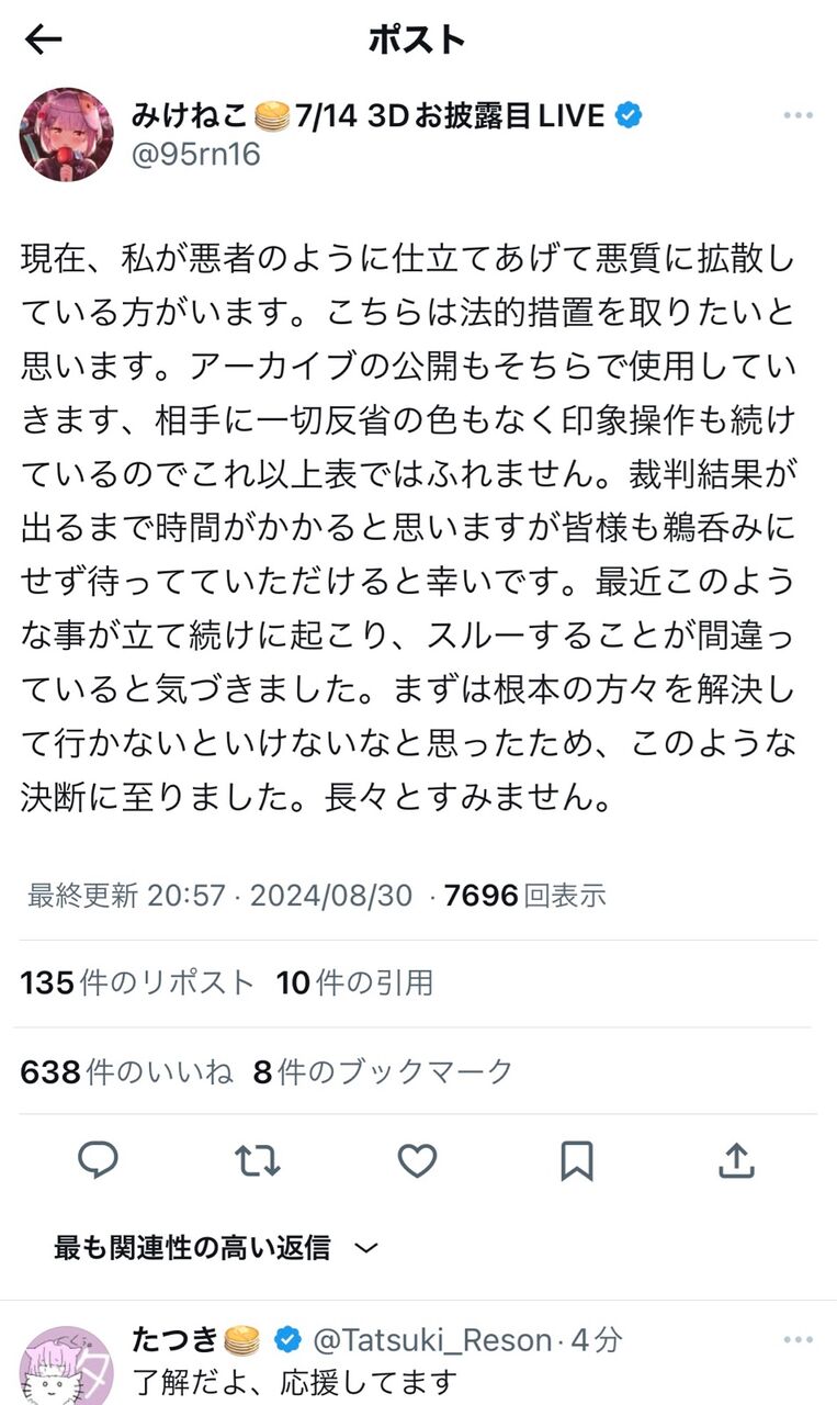 【Vtuber】みけねこ、戦闘モードへ「私は悪者じゃない」