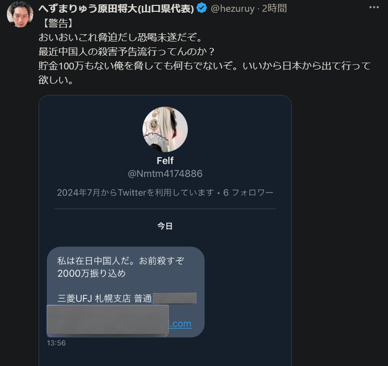 【鹿】へずま、中国人🇨🇳による殺害予告を流行らせる