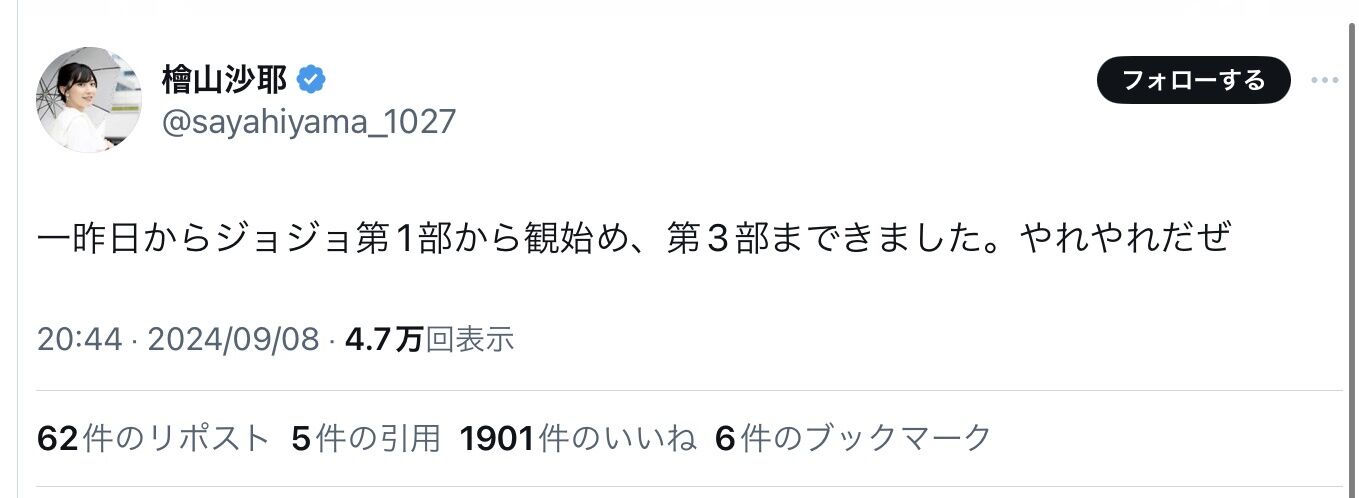【朗報】檜山沙耶、ジョジョ視聴開始!2日間で三部まで「やれやれだぜ」