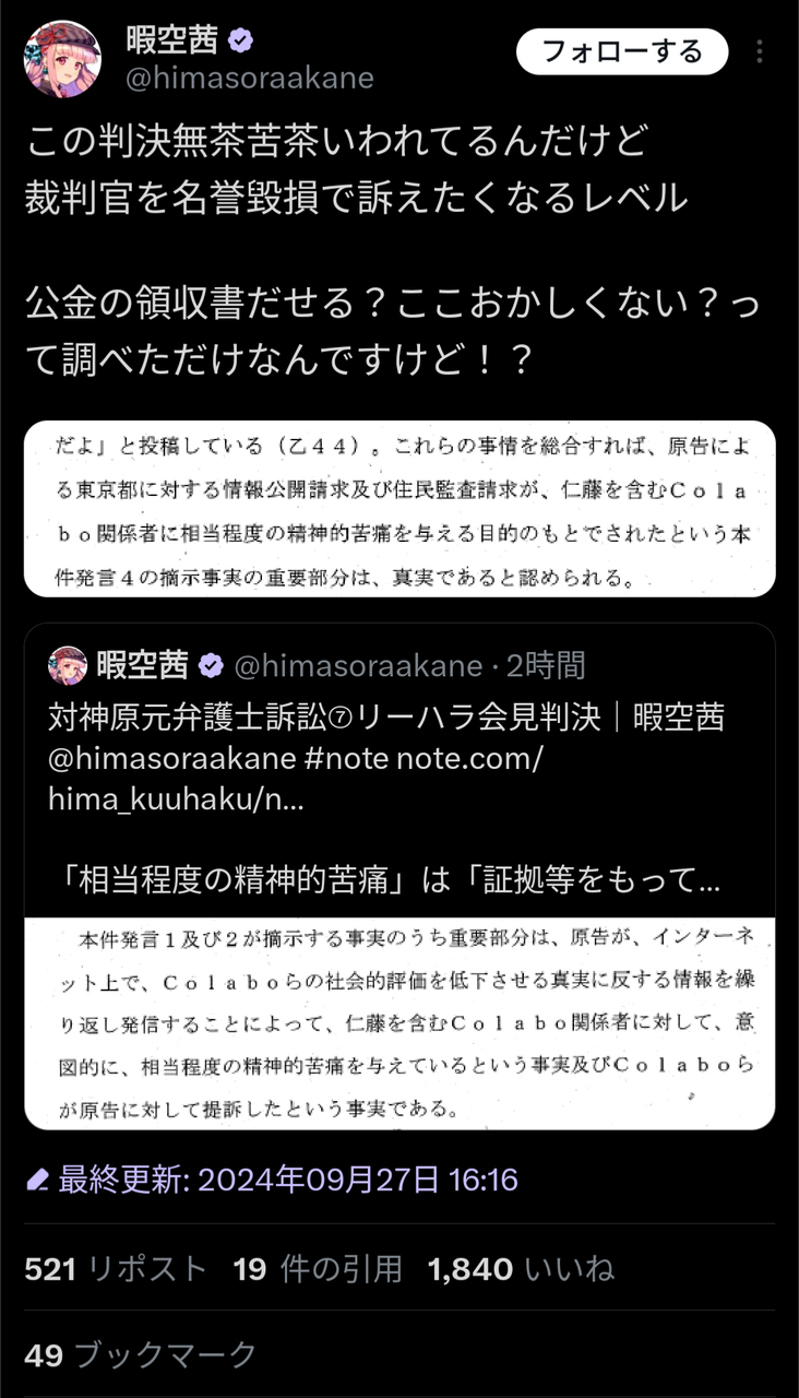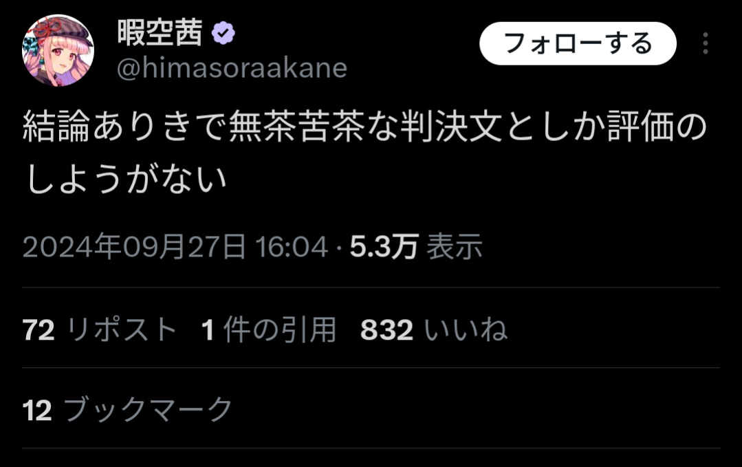 【敗訴】暇空茜、裁判負けて「裁判官を名誉棄損で訴えたい」と駄々こねる