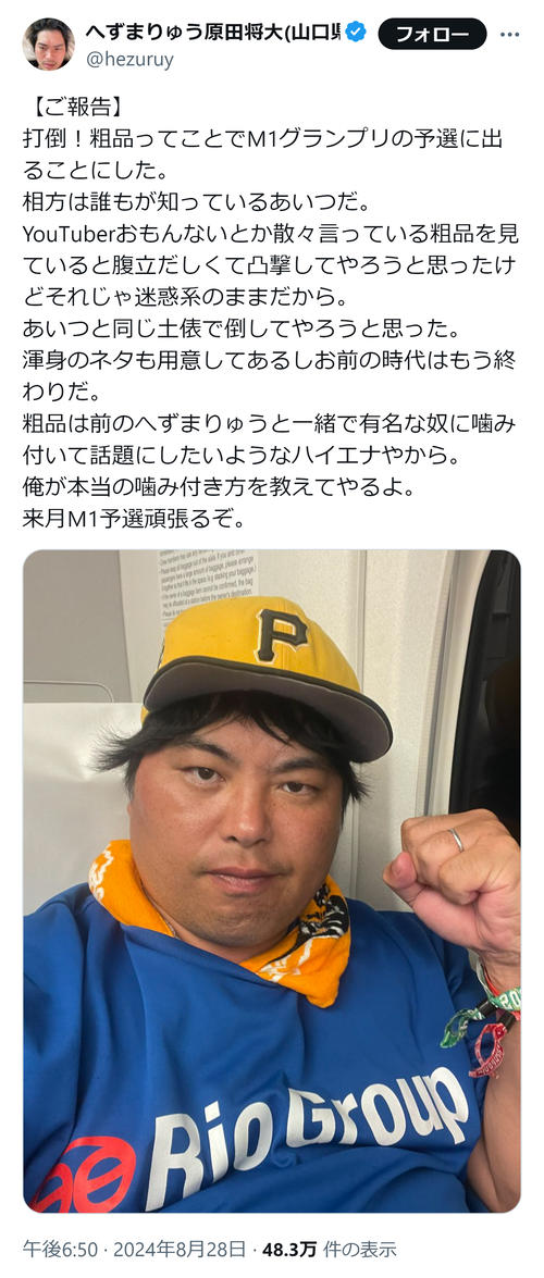 …予選出場を宣言。「打倒!粗品ってことでM1グランプリの予選に出ることにした」「YouTuberおもんないとか散々言っている粗品を見ていると腹立だしくて…