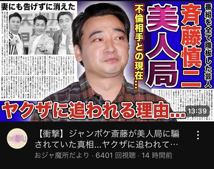 【憶測】ジャンポケ斎藤、YouTuberがデマ拡散…不倫,暴力団,美人局,隠し子,監禁,隔離病棟,余命宣告?