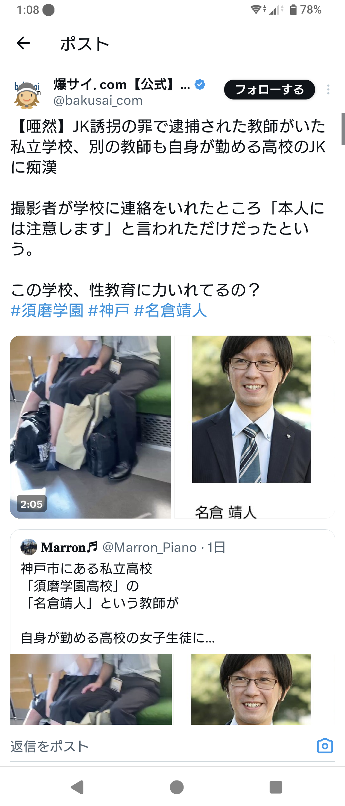 【停職処分】男性教師、電車内でJK生徒の体触って顔&氏名晒される 2024年10月5日 最終更新日時 : 2024年10月5日 ぐはっアンテナ 八木勇征の魅力を徹底解剖!彼の成長と影響 【芸能】堺正章が語る 人気ドラマ『西遊記』打ち切りの真相 「天竺に着く前に終わった…」 【LDH】三代目JSB今市隆二メンバー 活動自粛・・・ 【画像】井口裕香さん(37)、まだまだ全然イケるwwwwwwwwwwwwwwwwwwwwwwwwwwwwwwwww ジャングリア沖縄がここまで叩かれている理由がわかったwwwwwwwwww 【苦悩】奥菜恵「自分では清純派とも魔性とも思っていなかった」 【画像】吉岡里帆、理想の男性は「京都の人より九州男児が好き」 【画像】広末涼子さん(45)の近影 【画像】ジャングリア沖縄🌿🦖、ファンもアンチも黙らせてしまう 元坂道?アイドルがデビュー 【停職処分】男性教師、電車内でJK生徒の体触って顔&氏名晒される 須磨学園中学校・高等学校 須磨学園中学校・高等学校(すまがくえんちゅうがっこう・こうとうがっこう)は、兵庫県神戸市須磨区板宿町三丁目にある私立中学校・高等学校。 最寄り駅は神戸市営地下鉄西神・山手線及び山陽電鉄本線板宿駅。最寄駅から12分ほどかかる。設置者は学校法人須磨学園で、学園長はアスキー創業者の西和彦。 中学入学者 Aコース(難関国公立大)… 9キロバイト (1,030 語) - 2024年10月2日 (水) 12:52 (出典 【動画】明らかに変態な教師見つかる) 1 それでも動く名無し :2024/10/03(木) 01:09:00.87 ID:RLyIgEZL0 (出典 i.imgur.com) (出典 video.twimg.com) ?tag=12 (出典 【動画】明らかに変*な教師見つかる) 続きを読む 続きを見る 八木勇征の魅力を徹底解剖!彼の成長と影響 【芸能】堺正章が語る 人気ドラマ『西遊記』打ち切りの真相 「天竺に着く前に終わった…」 【LDH】三代目JSB今市隆二メンバー 活動自粛・・・ 【画像】井口裕香さん(37)、まだまだ全然イケるwwwwwwwwwwwwwwwwwwwwwwwwwwwwwwwww ジャングリア沖縄がここまで叩かれている理由がわかったwwwwwwwwww 【苦悩】奥菜恵「自分では清純派とも魔性とも思っていなかった」 【画像】吉岡里帆、理想の男性は「京都の人より九州男児が好き」 【画像】広末涼子さん(45)の近影 関連記事 関連記事はありません。