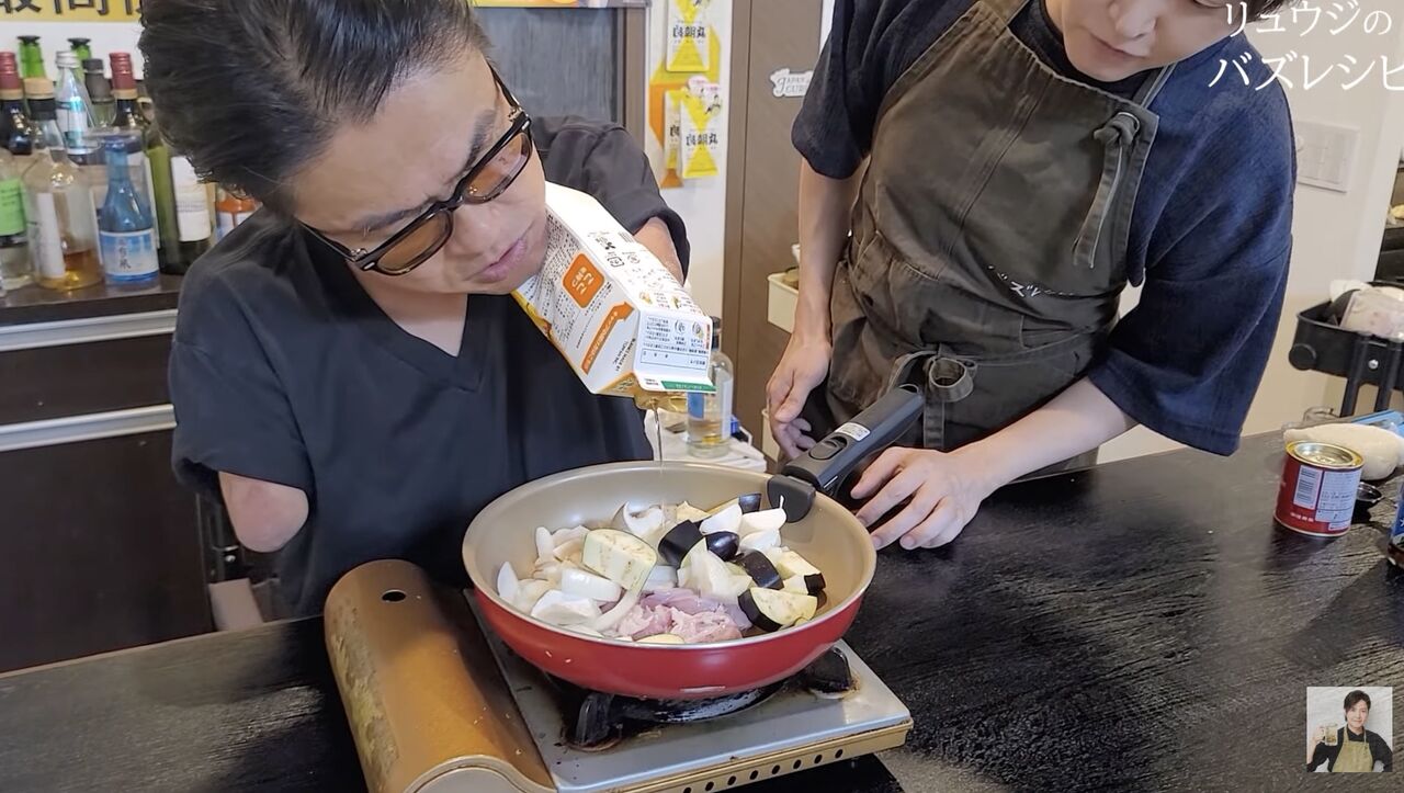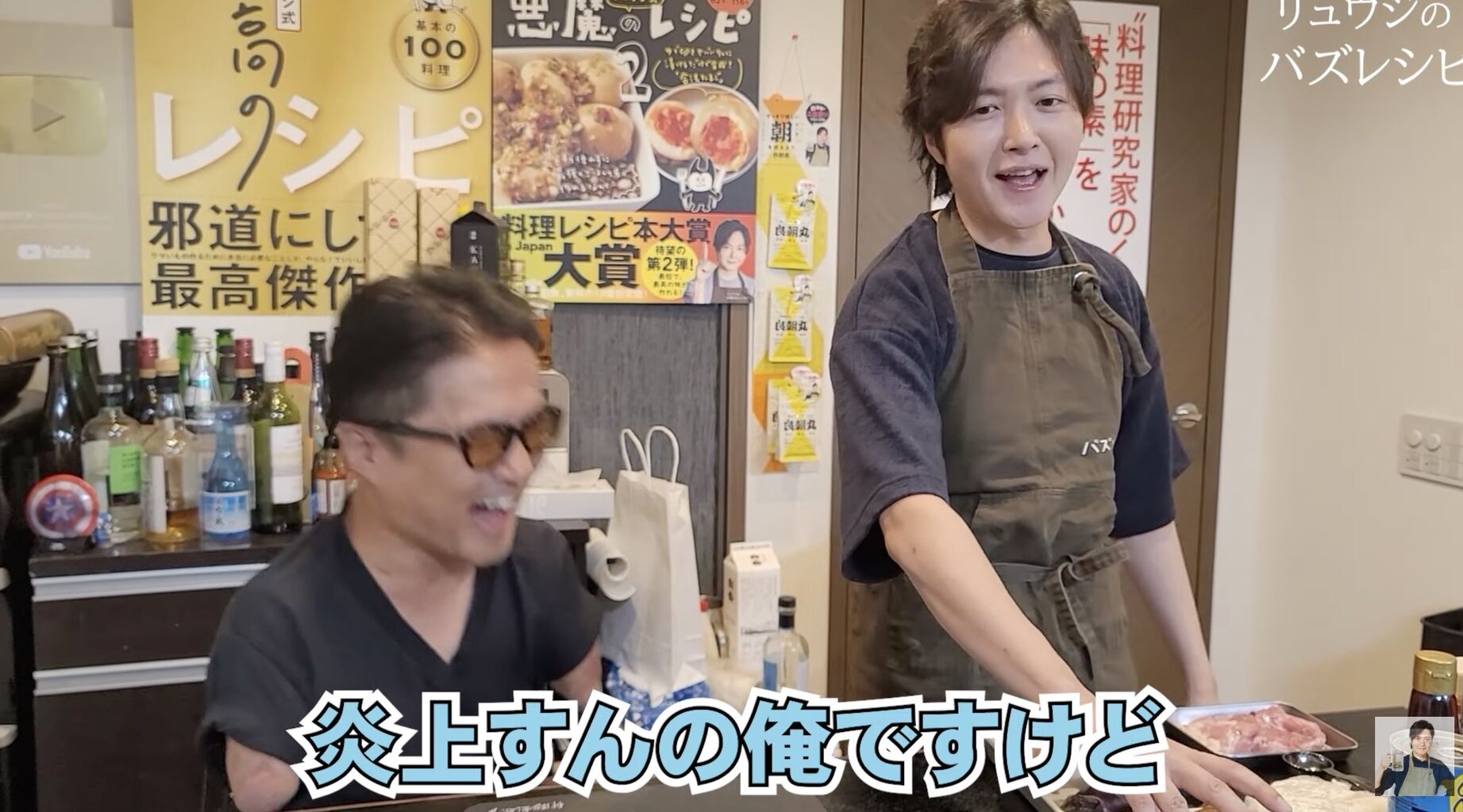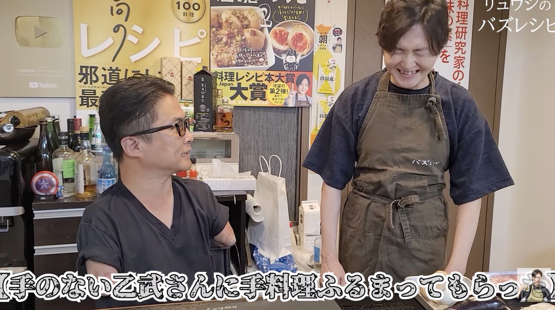 先天性四肢欠損症の乙武氏と料理する内容で、動画では「1つだけお願いがある。タイトルを『手の無い乙武さんに手料理を振る舞ってもらった』で。それでいきましょう」と乙武氏から提案が。リュウジ氏は「いいんですか? 炎上すんのは俺ですけど。乙武さんがそう言ってくれると心が楽になる」と話した。