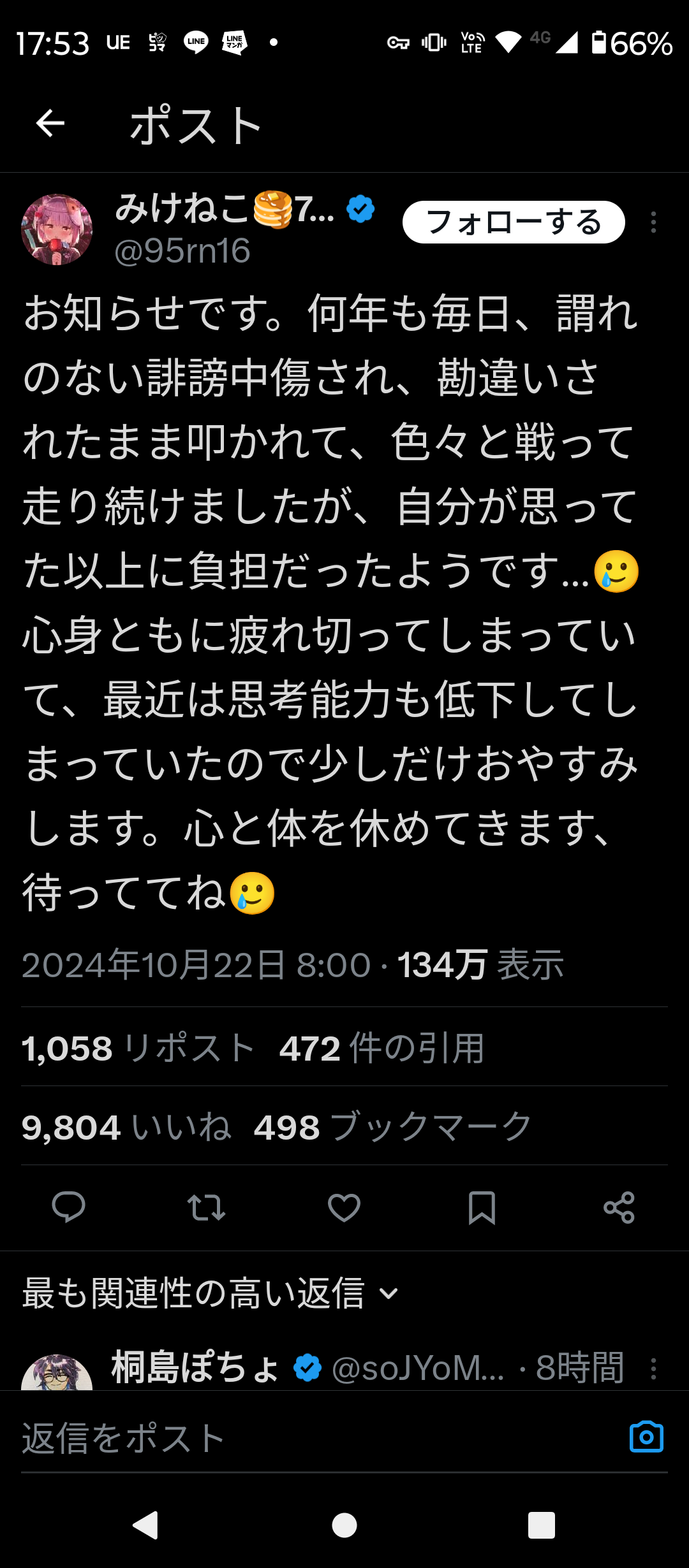 【許さん】みけねこ、お前らのせいで活動休止へ… 2024年10月27日 最終更新日時 : 2024年10月27日 ぐはっアンテナ 八木勇征の魅力を徹底解剖!彼の成長と影響 【芸能】堺正章が語る 人気ドラマ『西遊記』打ち切りの真相 「天竺に着く前に終わった…」 【LDH】三代目JSB今市隆二メンバー 活動自粛・・・ 【画像】井口裕香さん(37)、まだまだ全然イケるwwwwwwwwwwwwwwwwwwwwwwwwwwwwwwwww ジャングリア沖縄がここまで叩かれている理由がわかったwwwwwwwwww 【苦悩】奥菜恵「自分では清純派とも魔性とも思っていなかった」 【画像】吉岡里帆、理想の男性は「京都の人より九州男児が好き」 【画像】広末涼子さん(45)の近影 【画像】ジャングリア沖縄🌿🦖、ファンもアンチも黙らせてしまう 元坂道?アイドルがデビュー 【許さん】みけねこ、お前らのせいで活動休止へ… みけねこ (VTuber) みけねこが元妻であることは認めていない。本項では元夫とされる人物の主張を尊重しA氏と呼称する。 2009年に恋のから騒ぎに16期生の一人として出演。 2011年ごろよりニコニコ生放送で「みけ猫@泥」名義で活動を開始。 2019年頃になるとみけねこ名義では活動休止。… 9キロバイト (1,055 語) - 2024年10月11日 (金) 00:51 (出典 www.mag2.com) (出典 みけねこさんお前らのせいで活動休止してしまう…) 1 以下、5ちゃんねるからVIPがお送りします :2024/10/23(水) 22:08:09.804 ID:Bsc2+DTl0 お前ら絶対許さねえ…😡 (出典 i.imgur.com) (出典 みけねこさんお前らのせいで活動休止してしまう…) 続きを読む 続きを見る 八木勇征の魅力を徹底解剖!彼の成長と影響 【芸能】堺正章が語る 人気ドラマ『西遊記』打ち切りの真相 「天竺に着く前に終わった…」 【LDH】三代目JSB今市隆二メンバー 活動自粛・・・ 【画像】井口裕香さん(37)、まだまだ全然イケるwwwwwwwwwwwwwwwwwwwwwwwwwwwwwwwww ジャングリア沖縄がここまで叩かれている理由がわかったwwwwwwwwww 【苦悩】奥菜恵「自分では清純派とも魔性とも思っていなかった」 【画像】吉岡里帆、理想の男性は「京都の人より九州男児が好き」 【画像】広末涼子さん(45)の近影 関連記事 関連記事はありません。