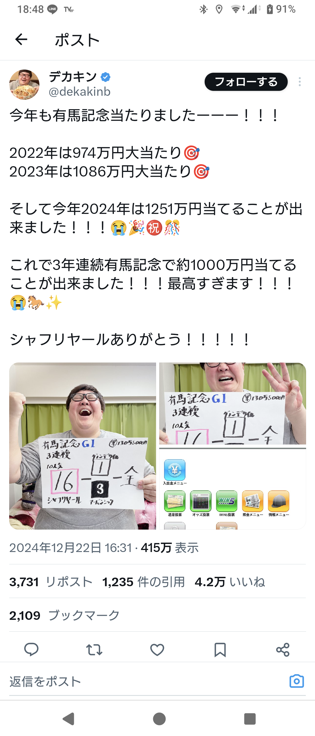 【馬券】ヒカキン系ユーチューバー、有馬記念3年連続1000万円!凄すぎ 2024年12月24日 最終更新日時 : 2024年12月24日 ぐはっアンテナ 八木勇征の魅力を徹底解剖!彼の成長と影響 【芸能】堺正章が語る 人気ドラマ『西遊記』打ち切りの真相 「天竺に着く前に終わった…」 【LDH】三代目JSB今市隆二メンバー 活動自粛・・・ 【画像】井口裕香さん(37)、まだまだ全然イケるwwwwwwwwwwwwwwwwwwwwwwwwwwwwwwwww ジャングリア沖縄がここまで叩かれている理由がわかったwwwwwwwwww 【苦悩】奥菜恵「自分では清純派とも魔性とも思っていなかった」 【画像】吉岡里帆、理想の男性は「京都の人より九州男児が好き」 【画像】広末涼子さん(45)の近影 【画像】ジャングリア沖縄🌿🦖、ファンもアンチも黙らせてしまう 元坂道?アイドルがデビュー 【馬券】ヒカキン系ユーチューバー、有馬記念3年連続1000万円!凄すぎ デカキン ONE(ジェネシスワン)辞めました - YouTube 2016年11月24日 ^ “E-DGEにデカキンが所属 | ニュースリリース”. BitStar(ビットスター). 2021年6月18日閲覧。 ^ a b ヒカキン×デカキンついに会う!初対面でデカキンさんにドッキリしたら号泣www【感動】 - YouTube HikakinTV… 13キロバイト (1,391 語) - 2024年11月29日 (金) 11:22 有馬記念 された(名称の選定経緯については後述)。 しかし、第1回の興奮も冷めやらぬ1957年(昭和32年)1月9日に創設者の有馬が急逝したことを受け、第2回からは有馬の功績を称えて「有馬記念(第○○回グランプリ)」に改称。以来、中央競馬の一年を締めくくるレースとして定着した。施行場は創設時より中山競馬場で… 80キロバイト (7,529 語) - 2024年12月22日 (日) 14:44 有馬記念3年連続1000万円当てるぞ!!!2024年有馬記念は本命シャフリヤール!!!(出典 Youtube) (出典 ヒカキン系YouTuberデカキン、3年連続1000万円馬券を当てる) 1 それでも動く名無し :2024/12/22(日) 18:49:19.33 ID:ksnKH7cN0 (出典 i.imgur.com) (出典 i.imgur.com) (出典 ヒカキン系YouTuberデカキン、3年連続1000万円馬券を当てる) 続きを読む 続きを見る 八木勇征の魅力を徹底解剖!彼の成長と影響 【芸能】堺正章が語る 人気ドラマ『西遊記』打ち切りの真相 「天竺に着く前に終わった…」 【LDH】三代目JSB今市隆二メンバー 活動自粛・・・ 【画像】井口裕香さん(37)、まだまだ全然イケるwwwwwwwwwwwwwwwwwwwwwwwwwwwwwwwww ジャングリア沖縄がここまで叩かれている理由がわかったwwwwwwwwww 【苦悩】奥菜恵「自分では清純派とも魔性とも思っていなかった」 【画像】吉岡里帆、理想の男性は「京都の人より九州男児が好き」 【画像】広末涼子さん(45)の近影 関連記事 関連記事はありません。