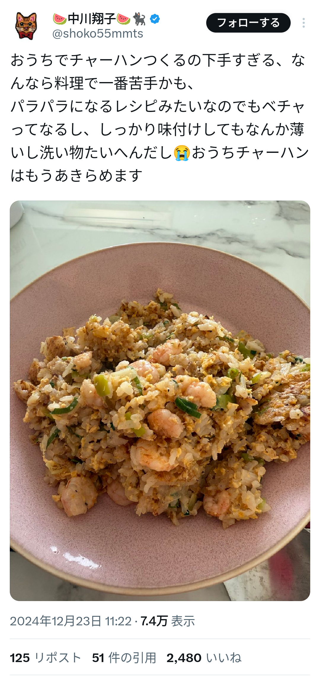 【悲報】中川翔子の手づくり炒飯...ベチャベチャーハン「もうあきらめます」 2024年12月25日 最終更新日時 : 2024年12月25日 ぐはっアンテナ 八木勇征の魅力を徹底解剖!彼の成長と影響 【芸能】堺正章が語る 人気ドラマ『西遊記』打ち切りの真相 「天竺に着く前に終わった…」 【LDH】三代目JSB今市隆二メンバー 活動自粛・・・ 【画像】井口裕香さん(37)、まだまだ全然イケるwwwwwwwwwwwwwwwwwwwwwwwwwwwwwwwww ジャングリア沖縄がここまで叩かれている理由がわかったwwwwwwwwww 【苦悩】奥菜恵「自分では清純派とも魔性とも思っていなかった」 【画像】吉岡里帆、理想の男性は「京都の人より九州男児が好き」 【画像】広末涼子さん(45)の近影 【画像】ジャングリア沖縄🌿🦖、ファンもアンチも黙らせてしまう 元坂道?アイドルがデビュー 【悲報】中川翔子の手づくり炒飯...ベチャベチャーハン「もうあきらめます」 中川翔子 中川 翔子(なかがわ しょうこ、1985年5月5日 - )は、日本のバラエティアイドル、マルチタレント、歌手、YouTuber。旧芸名は中川 薔子。出生名は中川 しようこ、2023年4月の結婚を機に同年11月より本名を芸名と同じ翔子(しょうこ)へ改名した(後述。結婚後の姓は非公表)。所属事務所はワタ… 190キロバイト (21,273 語) - 2024年12月17日 (火) 21:38 チャーハン (炒飯からのリダイレクト) チャーハン(炒飯)は、炊きあがった米飯を様々な具材と共に油で炒めた中華料理のこと。焼きめしと呼ぶ地域もある。 隋代から宋代にかけての中国発祥の中華料理の一つ。『食経』という書物には、7世紀初めの隋の宰相が現代のチャーハンに似た「砕金飯(金のかけらのようなご飯、という意味)」と呼ばれる料理を食していた… 10キロバイト (1,153 語) - 2024年12月20日 (金) 08:01 (出典 contents.oricon.co.jp) (出典 【吉報】中川翔子さんが作ったチャーハン、めちゃくちゃ美味そうww) 1 以下、5ちゃんねるからVIPがお送りします🐙 :2024/12/23(月) 15:43:10.286 ID:x9kf1CEx0 https://x.com/shoko55mmts/status/1871018567463997798(出典 i.imgur.com) (出典 【吉報】中川翔子さんが作ったチャーハン、めちゃくちゃ美味そうww) 続きを読む 続きを見る 八木勇征の魅力を徹底解剖!彼の成長と影響 【芸能】堺正章が語る 人気ドラマ『西遊記』打ち切りの真相 「天竺に着く前に終わった…」 【LDH】三代目JSB今市隆二メンバー 活動自粛・・・ 【画像】井口裕香さん(37)、まだまだ全然イケるwwwwwwwwwwwwwwwwwwwwwwwwwwwwwwwww ジャングリア沖縄がここまで叩かれている理由がわかったwwwwwwwwww 【苦悩】奥菜恵「自分では清純派とも魔性とも思っていなかった」 【画像】吉岡里帆、理想の男性は「京都の人より九州男児が好き」 【画像】広末涼子さん(45)の近影 関連記事 関連記事はありません。