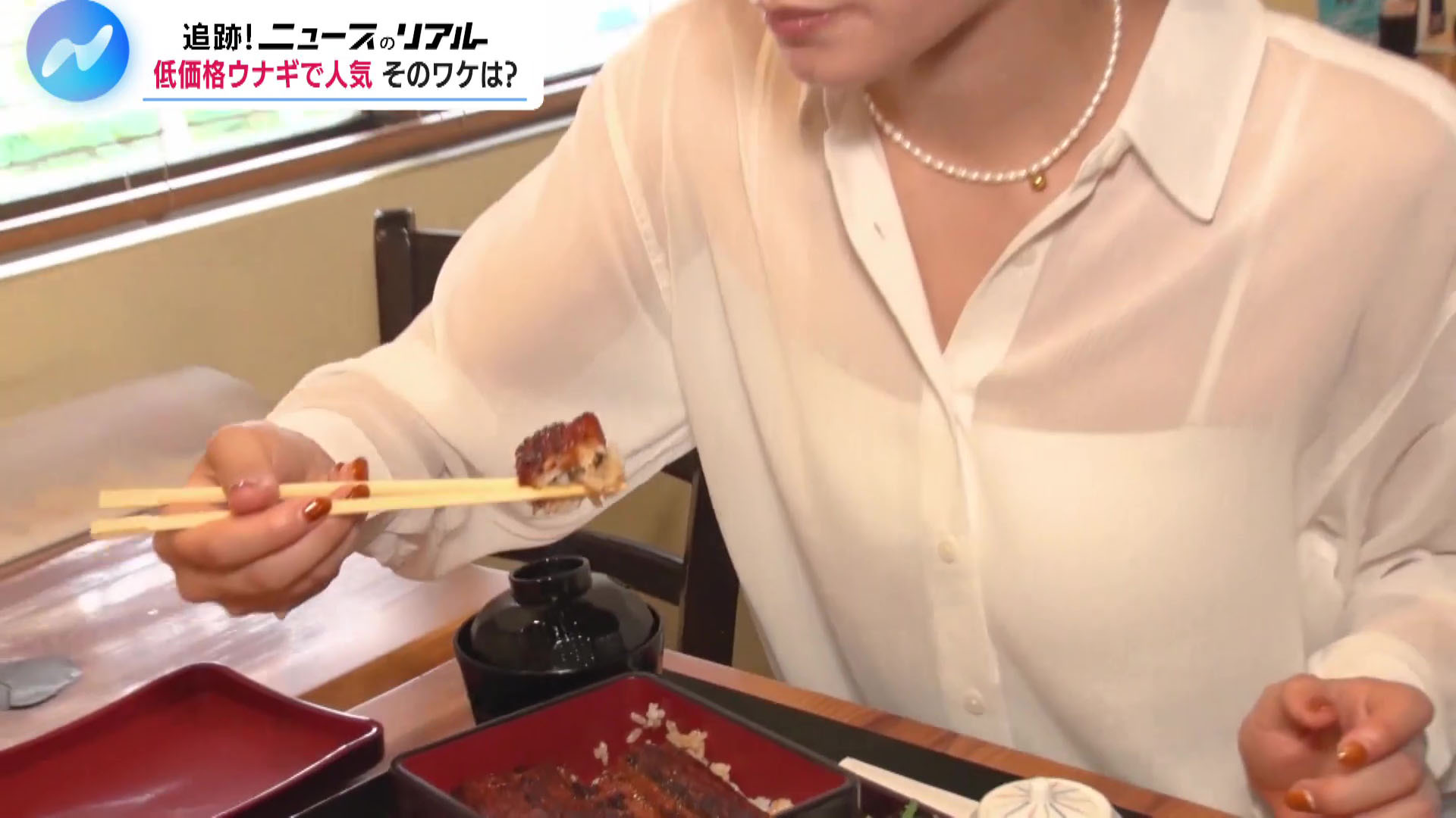 透け透け衣装でうなぎを食べるトラウデン直美キャスターは、スタジオのノースリーブもセクシーでした! GIF動画付きで! [2025年7月18日 NIKKEI NEWS NEXT]