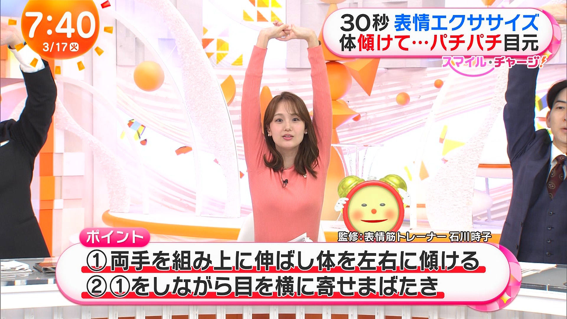 ピタピタニットのバンザイポーズで胸が強調されていた井上清華アナです! [2026年3月17日 めざましテレビ]