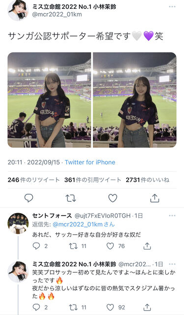 ミス立命館2022ファイナリストの小林茉鈴さんが京都サンガF.C.のユニフォームを着た姿を披露し、大きな反響を呼んでいる。