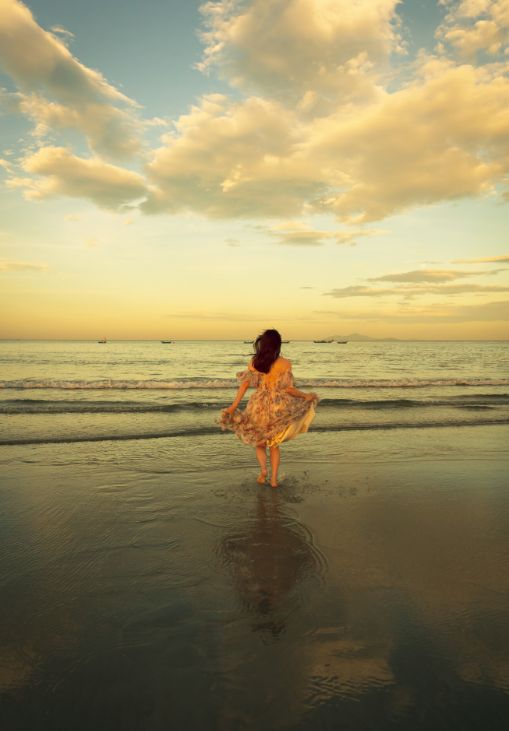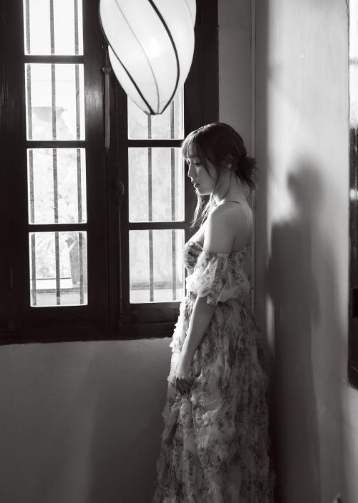 花柄のドレスを纏い、海に向かって走り出す表紙カットは、まさに「夜明け前(Vers l’Aube)」の象徴——始まりの瞬間を予感させる躍動感と、ベトナムの風景が織りなす幻想的な光の戯れが、彼女の表情に深い情感を宿す