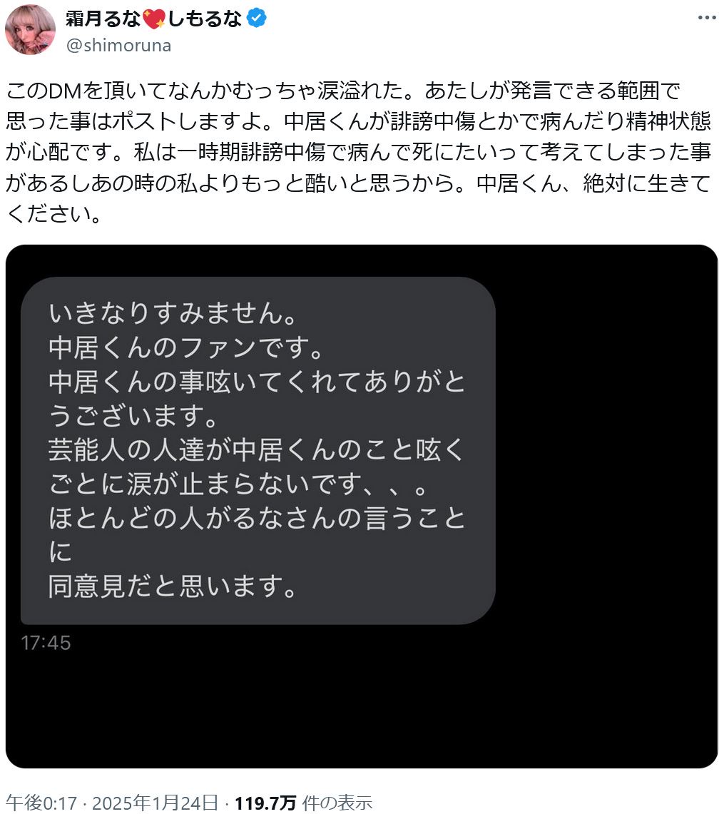 AV女優の霜月るながSNSで「中居くん絶対生きて」とコメントし話題に。騒動の渦中にある中居正広に対する思わぬエールに、ネットでは反響が広がっている。